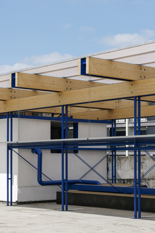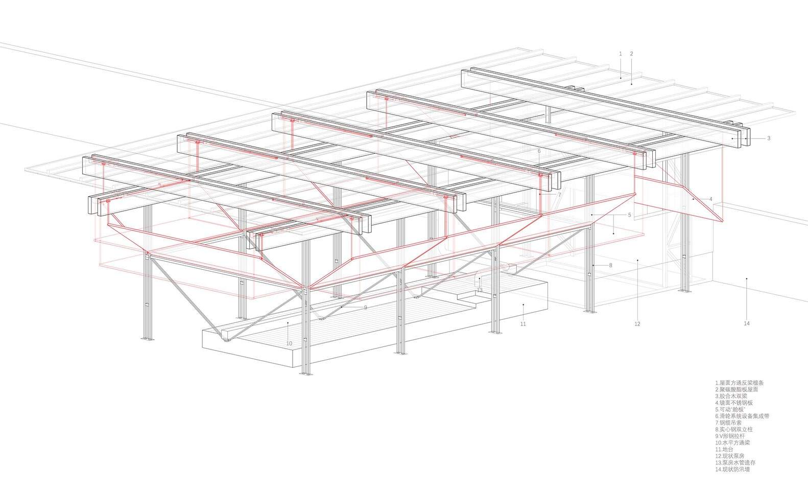 截面 50 的钢双立柱支撑起屋面的双层搭接胶合木双梁,木双梁中间设置了设备集成带,容纳了机械滑轮系统,并通过拉索悬吊周圈的金属 “舱板”。机械滑轮系统可让每块悬吊的舱板进行定角度翻转。舱板下端高度的斜向钢拉杆,共同构成倒 V 形剖面的结构,如同悬浮的 “船舱”。四组 V 形拉杆共同 “承托” 了台面上的钢梁 —— 用于补充整体结构的侧向稳定性。