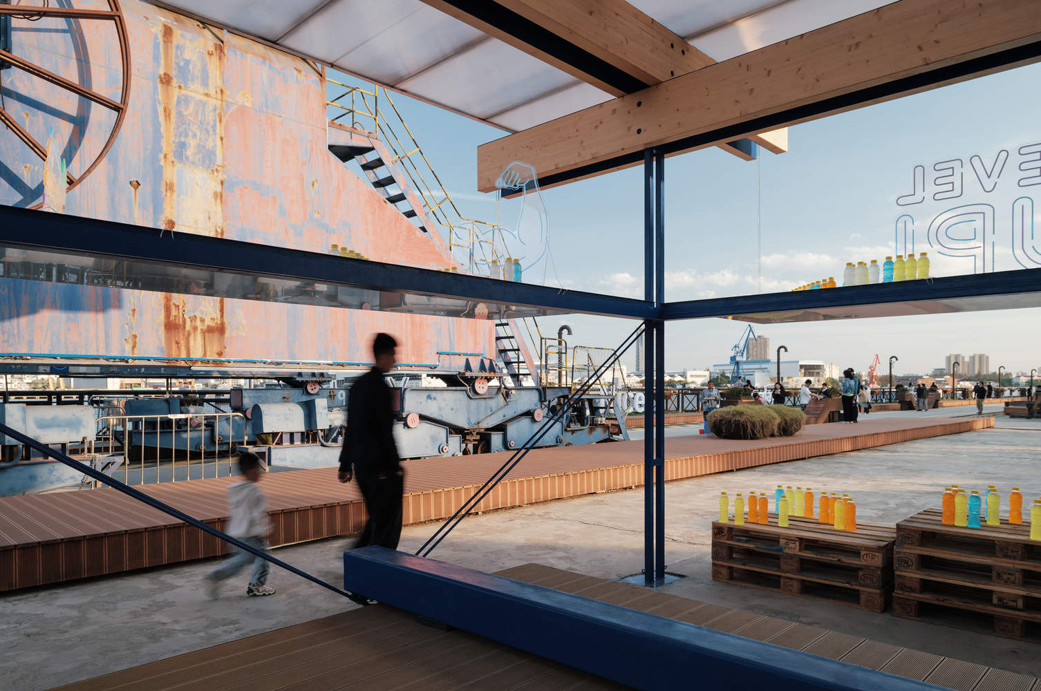 Since its deployment, the Floating Cabin has served as a resting space for citizens and tourists strolling by the river on a daily basis; various possible public activities have also taken place, such as acoustic concerts, temporary markets, and pop-up exhibitions. When the Floating Cabin served as the finishing line for the "Run, Liangzai!" city running event, the cabin panels were rotated horizontally and decorated with neon lights and sports drinks, blending the industrial temperament with the riverside vitality, thus providing potential scenarios for future event-driven light commercial operations. The Floating Cabin is a machine-like structure without a clear type. This inherent mobility is both a capture and presentation of the site characteristics of the shipbuilding yard's industrial facilities, and a response to changing contemporary public needs. Beyond the sense of place brought by the static structure, the mobility of the Floating Cabin possesses the potential to actively respond to the ever-changing surroundings. As the Floating Cabin slowly transforms from the static suspended feeling of the inclined cabin panels to the multi-layered structure of the horizontal configuration, it attempts to present changing object states and spatial conditions under the influence of different event drivers, thereby embracing contemporary uncertainty.