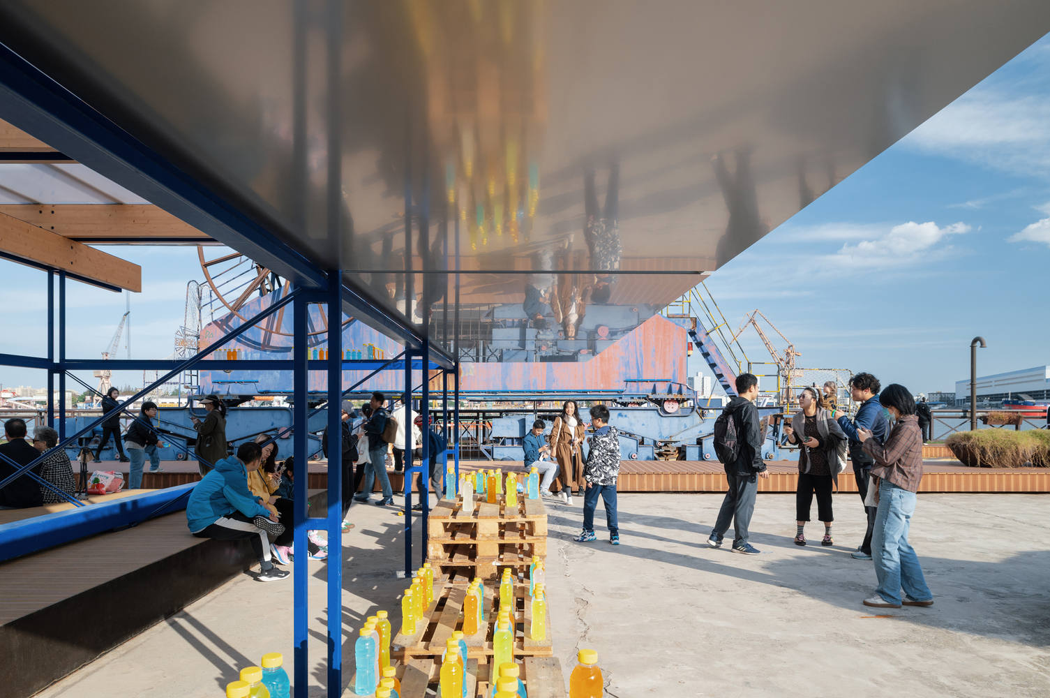 In its normal state, the cabin panels are tilted upwards, making the whole structure appear like a floating "ship's cabin" from the outside, defining a relatively stable space underneath for people to rest. The stainless steel panels subtly reflect the surrounding daily scenes on the pier. When the mechanical pulley system controls the cabin panels to rotate to a horizontal position, the Floating Cabin transforms into a more open structure. The horizontal panels function similarly to an overhead mezzanine in traditional market buildings, capable of accommodating exhibition objects or being planted with greenery to form an aerial garden.