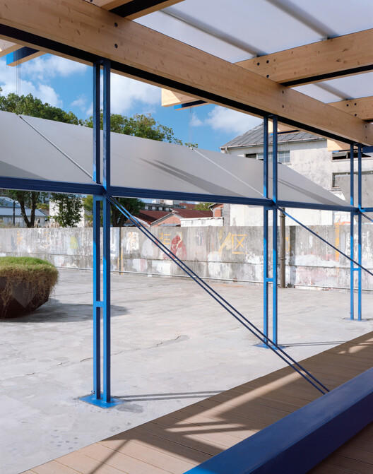 The pump house is attached to the flood control wall and has no floor slabs inside, making it an inaccessible industrial space connected to the river water beneath the pier; adjacent to the pump house is a concrete inspection platform raised from the pier ground, which houses the original pipes emerging from the pump room. The design completely preserves the pump house, pipes, and inspection platform, and bases the structure of the Floating Cabin upon them. The ground platform covered by the roof integrates elements of various force relationships such as support, suspension, and tensioning, constructing a special place that is both open and transparent, yet imbued with tension.