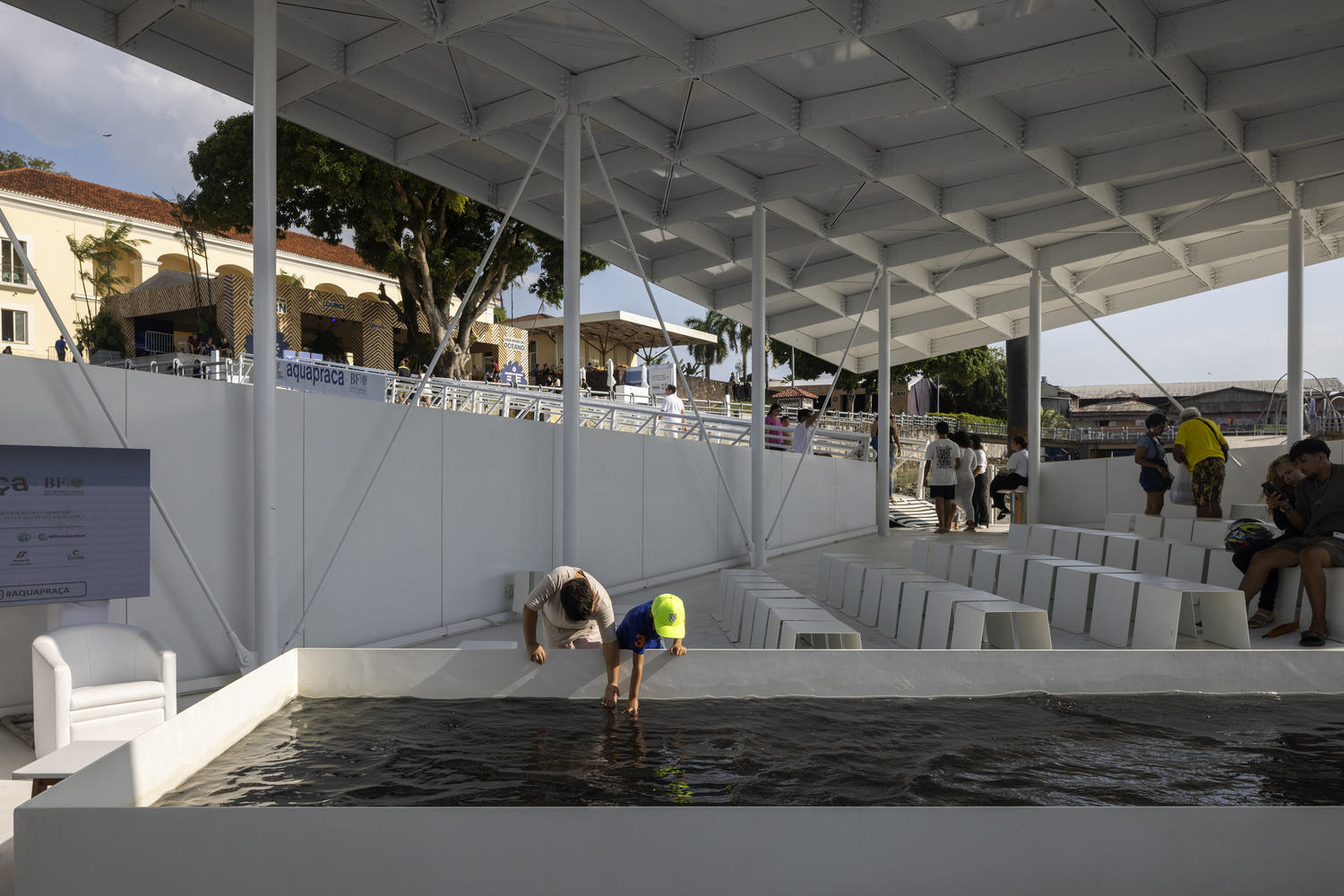 水韵广场停泊于亚马逊河系的瓜雅拉湾(Guajará Bay),这座 400 平方米(4000 平方英尺)的平台犹如一座全球性的公共广场,让人们能够以人类尺度亲身体验气候变化。该建筑采用阿基米德原理,以适应亚马逊三角洲每日高达四米的潮汐变化,每日展现瓜雅拉湾的水下景观。水韵广场为平衡水位与人类活动的设计提供了引人入胜的背景。通过漂浮,游客可以平视自然与建筑系统。在贝伦,水韵广场增设了屋顶结构,成为推动公民参与的催化剂,举办研讨会、文化活动和气候政策讨论。