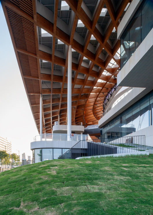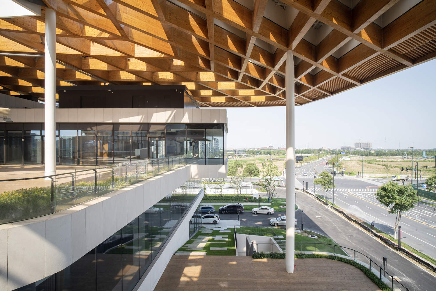 全域融合的生态与技术策略:建筑在设计中深度融合了可持续策略,特别是其创新的大屋面系统。钢木复合、光伏一体化的屋顶不仅提供了连续的、可步行的檐下林荫空间,有效提升了户外体验的舒适度,更重要的是,它将近500kW的光伏系统整合为建筑的“光合作用”器官,为建筑运行提供清洁能源。同时,通过 ETFE 天窗和中庭,实现了自然采光和通风的优化,将可持续技术转化为可感知的空间体验,展现了对低碳理念的深刻理解和技术落地。