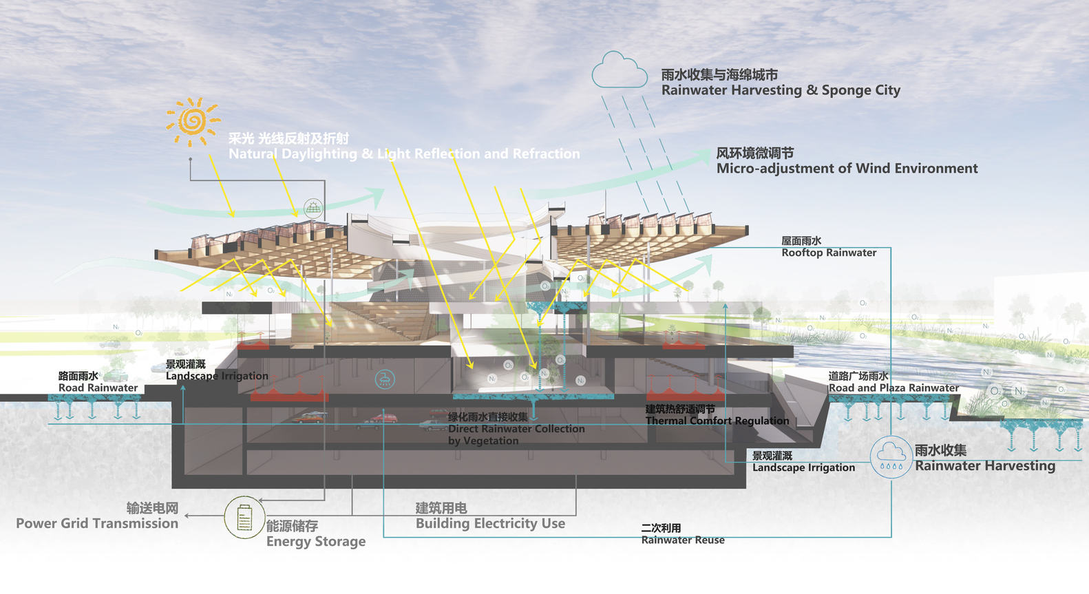 Above the eaves, the photovoltaic system coexists with the structural elements. With an installed capacity of about 500kW, the PV system performs photosynthesis like a tree canopy, providing clean energy for the building's air conditioning, lighting, and charging stations. It offers shading and guides wind in the summer, and manages rainwater drainage effectively, ensuring outdoor activities can proceed regardless of weather. The building's technical systems are no longer hidden but become part of the perceptible daily experience.