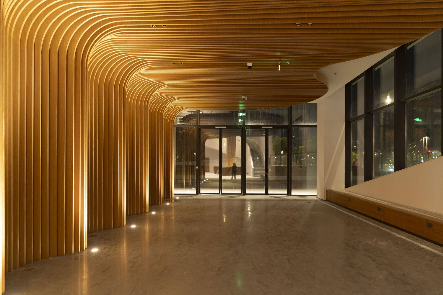 室内设计遵循文化中心各功能单元在使用方式与运营周期上的差异,采用“公共区域先行,商业单元留白”的策略:优先完成门厅、中庭、大厅等公共空间,以及多功能小剧场与影音空间;独立运营单元则为未来使用者预留设计弹性,减少资源浪费,也为空间持续更新创造条件。整体室内设计以性能为导向展开。不同空间从实际使用需求出发,围绕声学、采光与设备整合等关键要素,形成清晰而克制的空间表达。入口门厅通过节奏变化的格栅展陈墙,兼顾活动展示与空间秩序控制,并将照明与机电系统自然融入其中。大厅将结构柱与接待信息台、观众休息的需求相结合,用连续曲线的树状顶棚,和顶棚投影形成的铺地纹理,形成公共活动立体动线的空间限定。大厅立体动线串联展厅与多层会议空间,各会议单元从声学与照明性能出发整体设计。用吸音板吊顶单元和照明灯带实现构造与设备一体化处理。多功能小剧场设置独立门厅,运营时可分可合,内部通过可变座席与差异化声学设计,适应演出、论坛与发布会等多种使用场景。影音欣赏厅外的沙龙水吧,通过通透界面与户外平台衔接,使观影、交流与滨水公共生活自然延展。