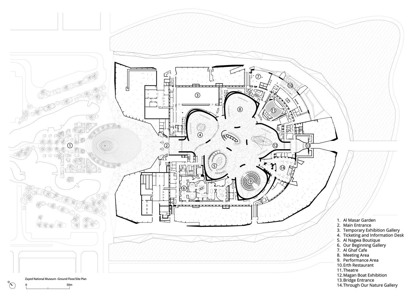 博物馆建筑之外,谢赫·扎耶德对自然的热爱通过 “Al Masar 花园” 得以体现,该花园将建筑与海岸相连。花园融合了景观与遗产,旨在成为社区的新资产,提供社交、娱乐和沉思的空间。游客还可选择一条遮荫路线,从地面层步行至土丘顶部的观景平台,该平台位于钢塔底部,可俯瞰周边地区的全景。