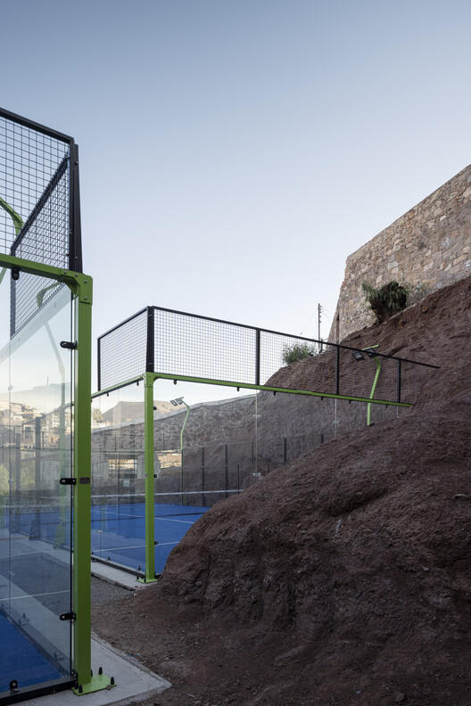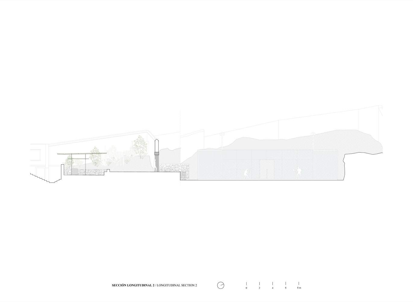 During the construction process, large-scale excavation of the bedrock was carried out. Its hard texture allowed it to be preserved and exposed, adding value and character to the experience of the players on the courts. The excavated material was reused in the rest of the buildings, achieving simplicity and unity with the environment.