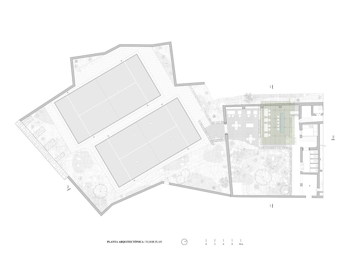 尽管宅邸占地面积广阔,但最佳选址却位于宅邸后方:一处毗邻沟壑的闲置空间,沟壑旁是一个古老的淤积水库。尽管地势陡峭,难以打造一个水平面,但考虑到这里能与城市的自然遗产直接接触,最终还是决定将板式网球俱乐部设于此处。
