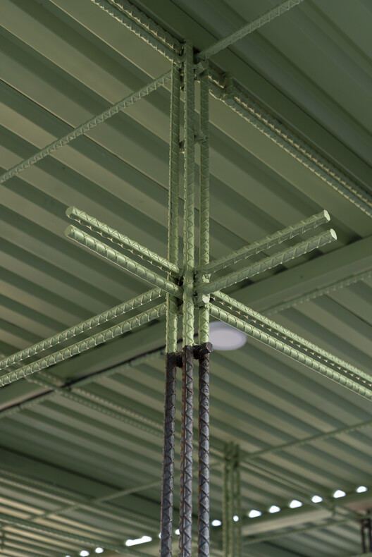 酒吧区域现场浇筑了一个混凝土吧台,吧台中的骨料源自挖掘出的同种岩石。此外,还设计了一个采用波纹钢筋丝网的新屋顶,旨在提高成本效益:通过理解这些较小截面钢材作为构件的潜力,当它们连接并交织在一起时,能够创造出与更昂贵型材相当的面积。这样一来,便形成了一个既纤细又非常坚固的结构体系。决定只对屋顶的顶部进行涂漆,以与现有植被相融合,而立柱则保持裸露,让岁月的痕迹在其上得以体现。