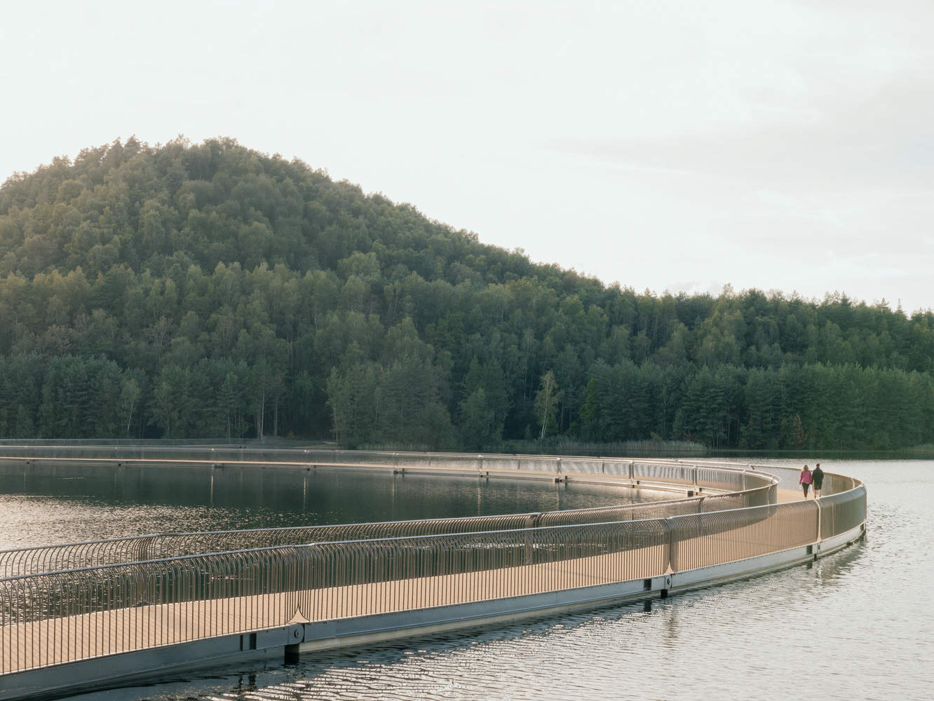 煤渣山(矿渣堆)的水畔,煤矿的往昔仍清晰可见,一座浮动的自行车桥在此铺展,优雅地滑过两座煤渣山间的池塘。“煤渣山间骑行”象征着将自然、遗产与未来紧密相连。