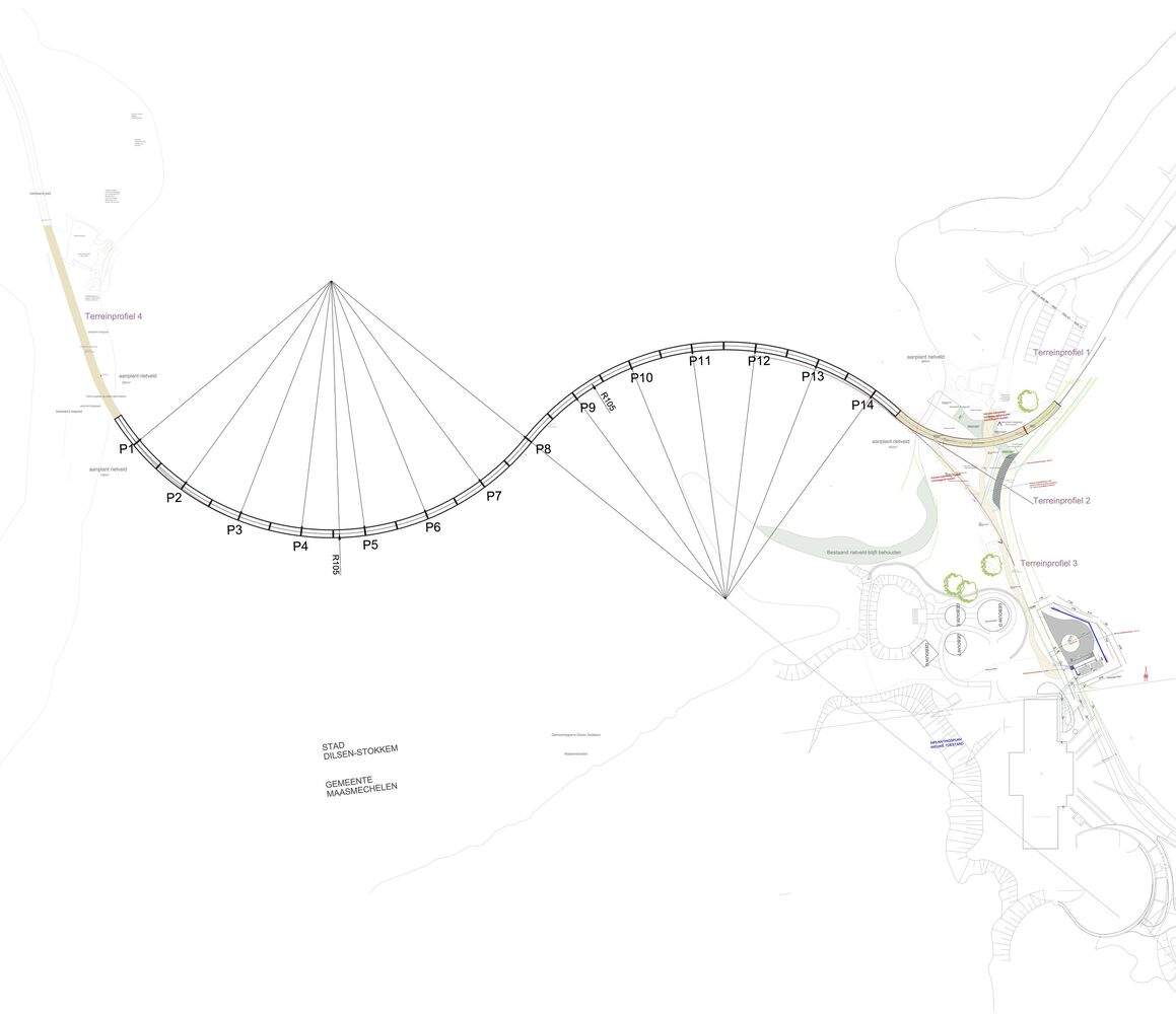 "Cycling Between Terrils" is a pontoon bridge that spans the border between two municipalities with a significant mining history. In the 20th century, the region was radically transformed by underground coal mining, resulting in these slag heaps. Later, gravel was extracted in the area, creating a large pond between the two slag heaps. For decades, all this mining activity significantly altered the terrain, shaping a unique landscape. Today, raw materials are no longer extracted, but the slag heaps remain an iconic feature of the Limburg landscape. Since the 21st century, this landscape has been transformed into a place for recreation and experience, where cyclists and hikers play an important role.