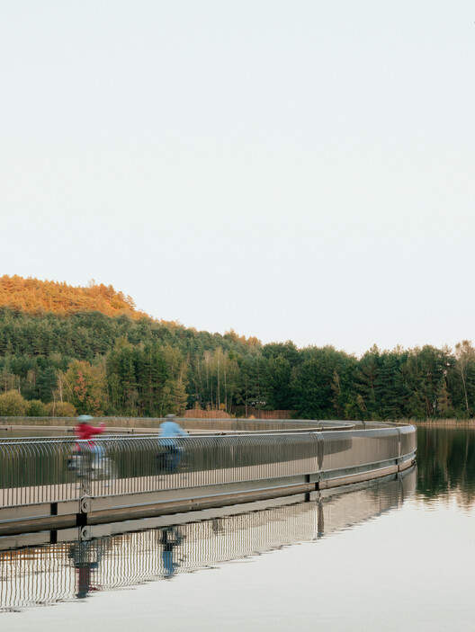 场地文脉与遗产的优雅融合:本项目最精髓之处在于其对场地历史文脉的深刻理解与尊重。它不仅是一座连接两岸的桥梁,更是工业遗址(煤渣山和水塘)向当代休闲景观转型的象征性构筑物。设计巧妙地将采矿留下的独特地形转化为极具吸引力的骑行体验,使得历史叙事得以延续。浮桥的形态与曲线设计,避免了对现有景观的突兀干预,而是以一种谦逊而优雅的姿态融入环境,实现了遗产保护与未来功能需求的完美平衡。