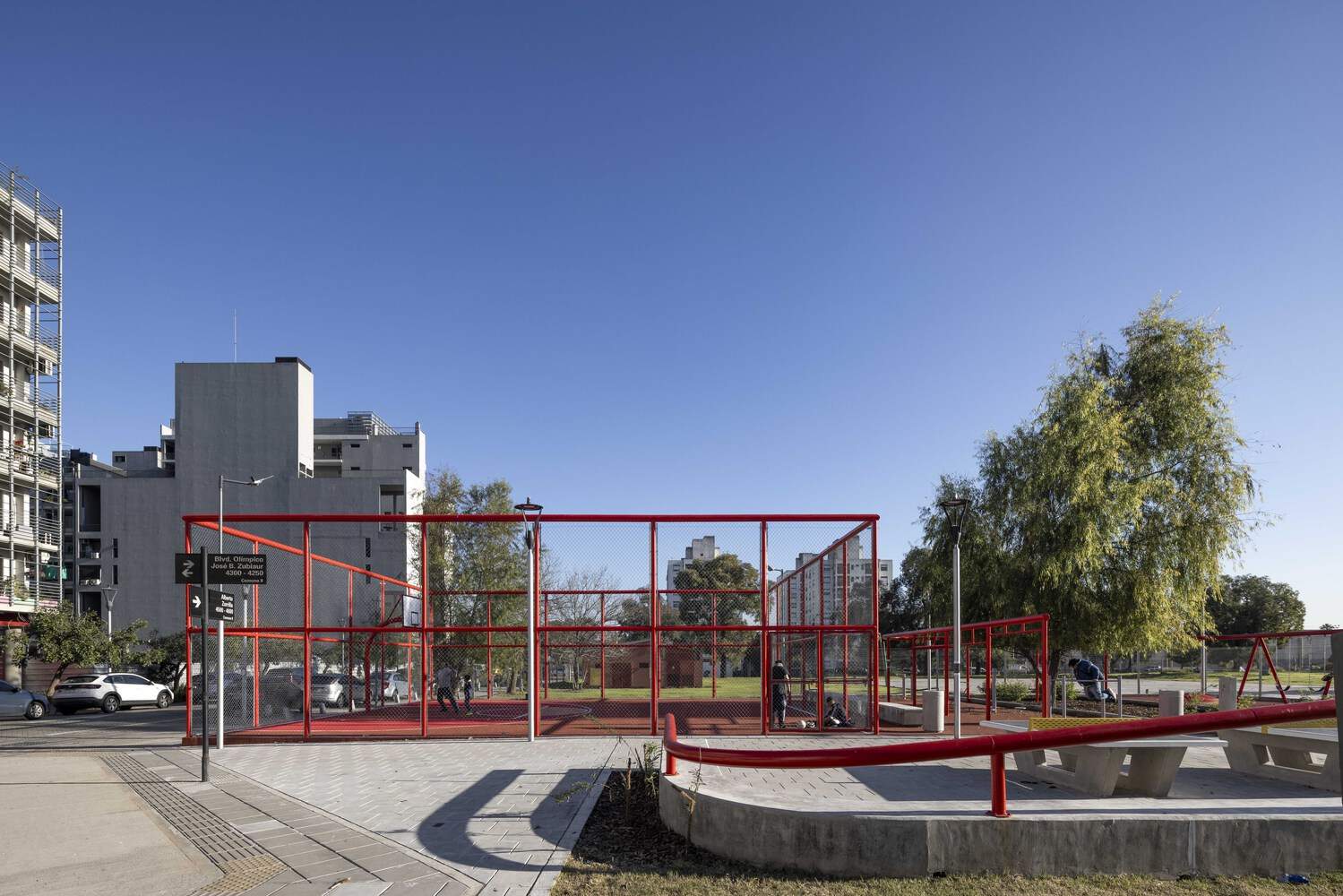 设计遵循通用无障碍标准,旨在打造一个包容且安全的环境,设有专门的游戏、休息和训练区域。其核心特色是一个独特的红色金属管结构,既具有强烈的视觉辨识度,又同时作为游戏设施、城市家具和标识的支撑。其布局界定了路径,并组织了广场的功能分区,包括一个篮球场、一个训练区和儿童游乐区。