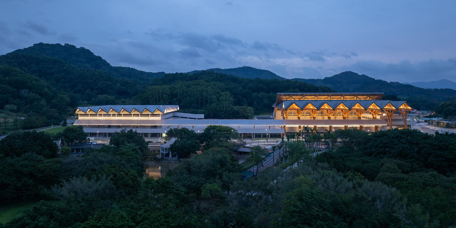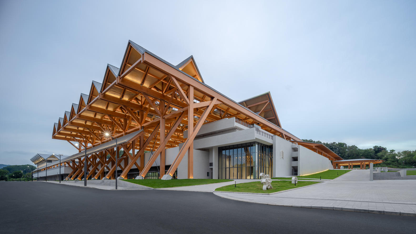 结构美学与地域文化重塑:建筑设计以“木构新境、众檐共景”为核心概念,大胆采用了胶合木结构,并从中国传统坡屋顶中汲取灵感,通过“发散式密檩”的形态创新,使传统语汇在现代语境下获得了新的生命力。这种将结构逻辑外显化的设计,不仅展现了木结构纯粹的构造美感,更在体量上实现了“凌空而出”的轻盈感,成功避免了大体量建筑可能带来的压迫感。