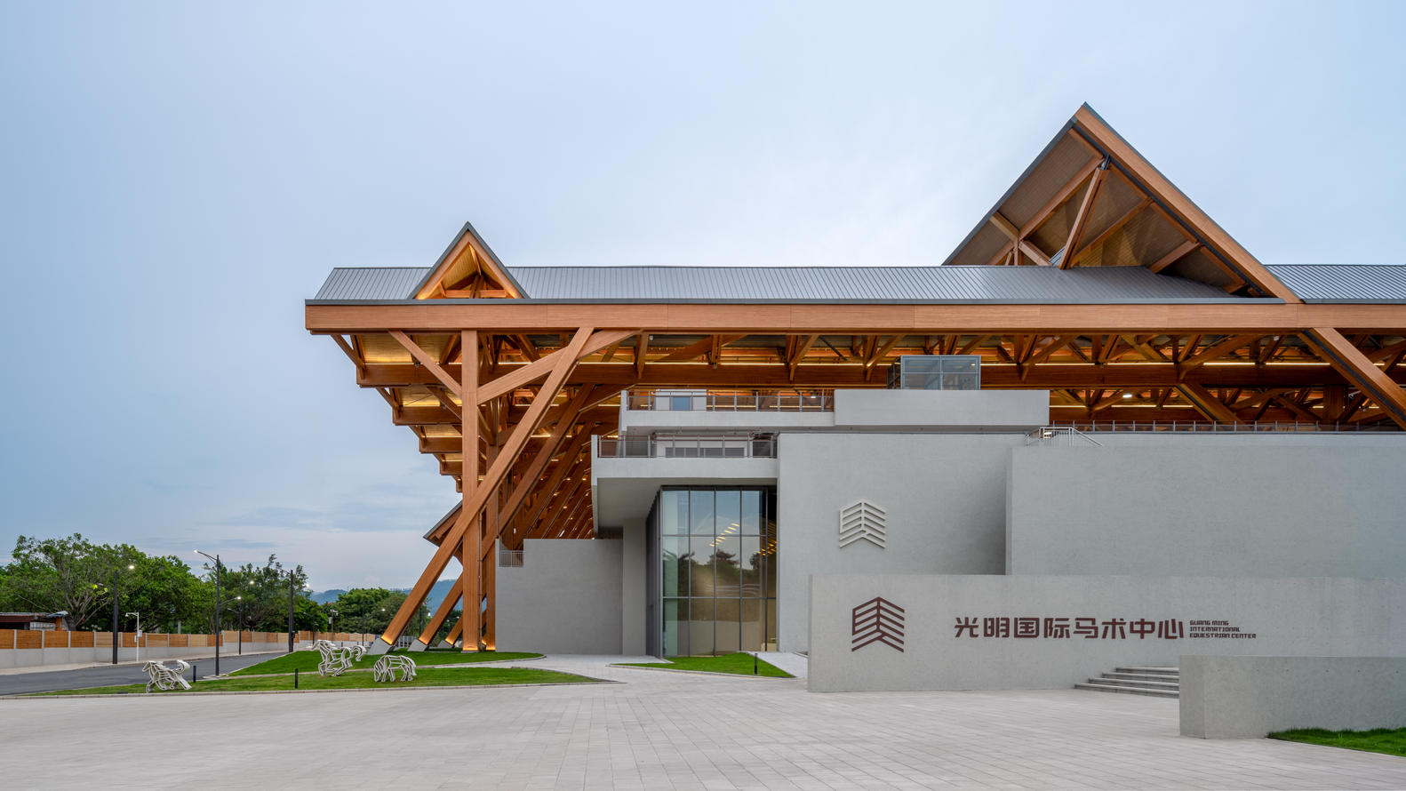 光明国际马术中心位于深圳市光明区光明街道,为第十五届全国运动会马术项目盛装舞步与障碍赛主场馆。项目用地面积50018㎡,总建筑面积44600㎡,项目功能包括主赛场、室内训练馆、室外训练场、赛事用房及马匹生活用房等,可容纳120匹马匹。