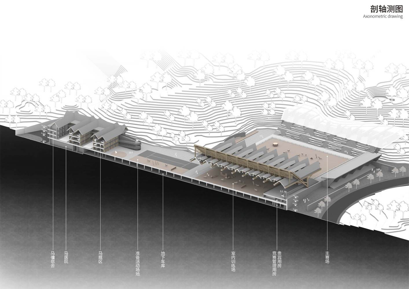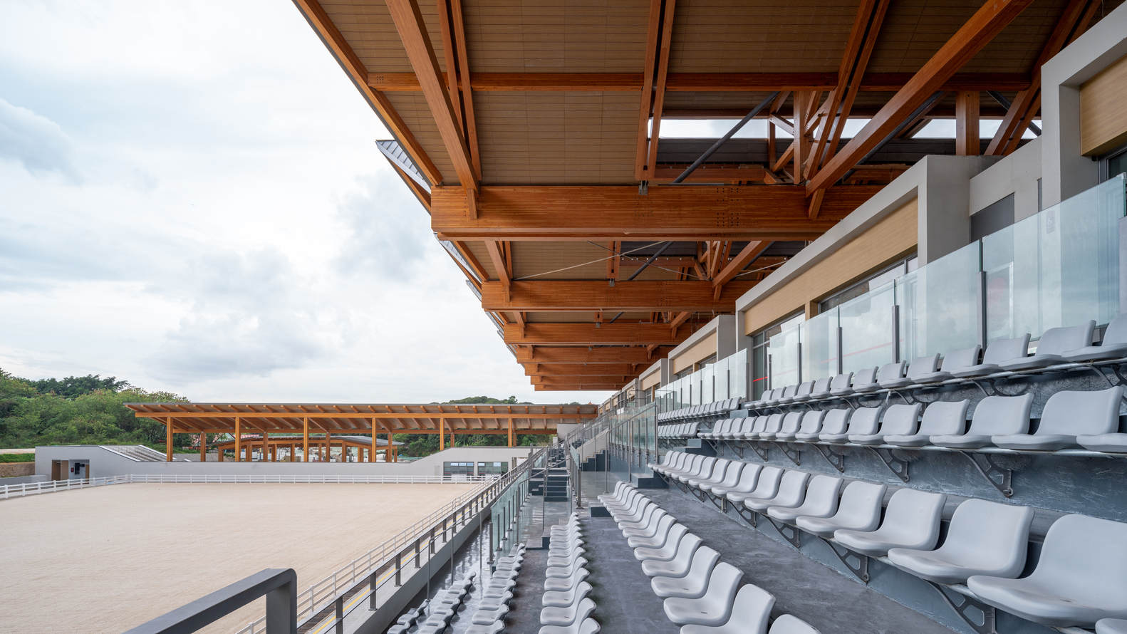 场地适应性与功能整合:项目巧妙地应对了场地东西向的显著高差,通过在城市道路一侧设置架空车库,将主要活动空间抬升,有效减少了对后侧自然山体的开挖影响,体现了对现有地形的尊重和负责任的场地策略。作为第十五届全运会马术主场馆,其功能布局清晰,包含了满足国际赛事需求的主赛场、室内外训练馆以及完善的配套用房,成功在有限的用地内实现了高强度的功能集成,保障了赛事运营的专业性。