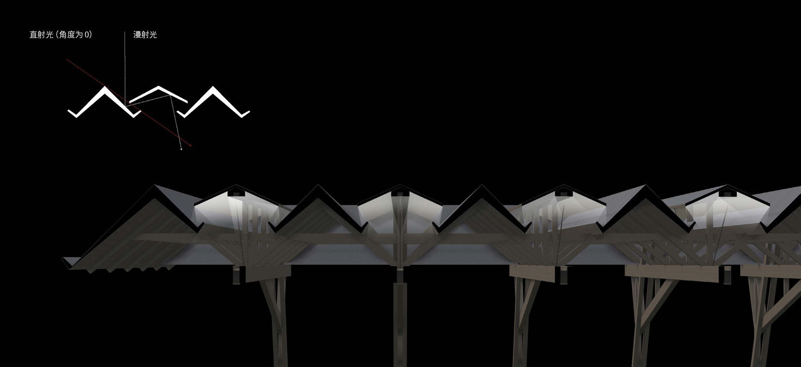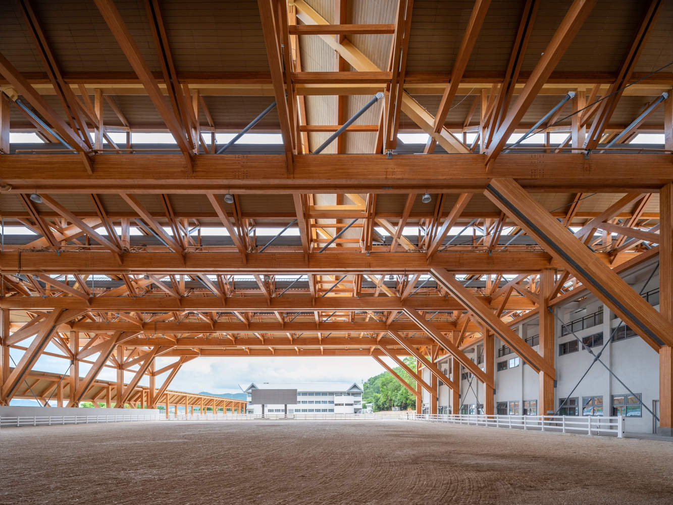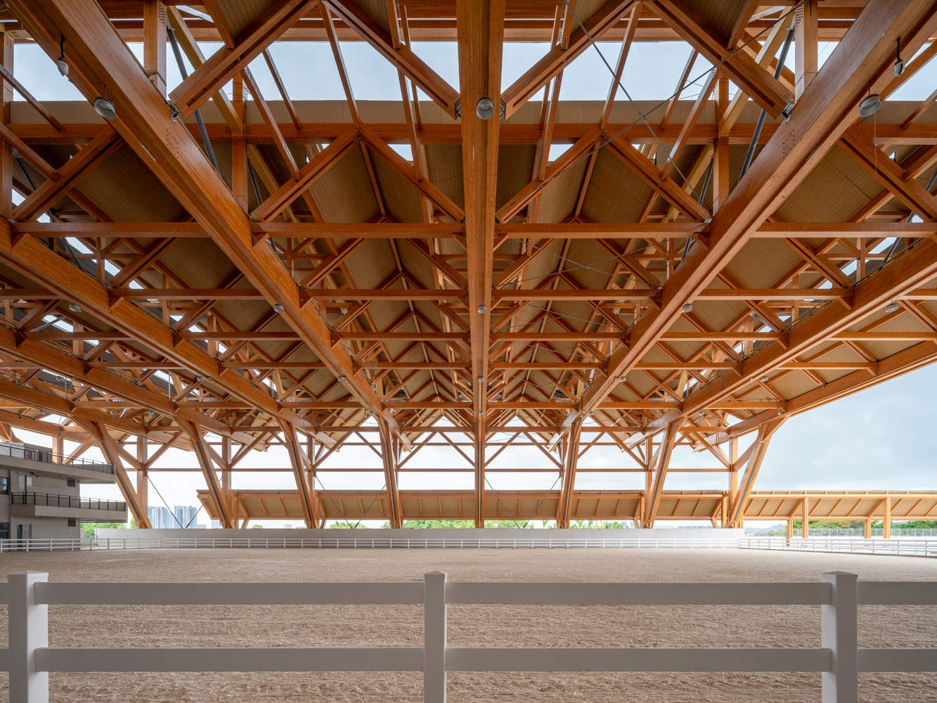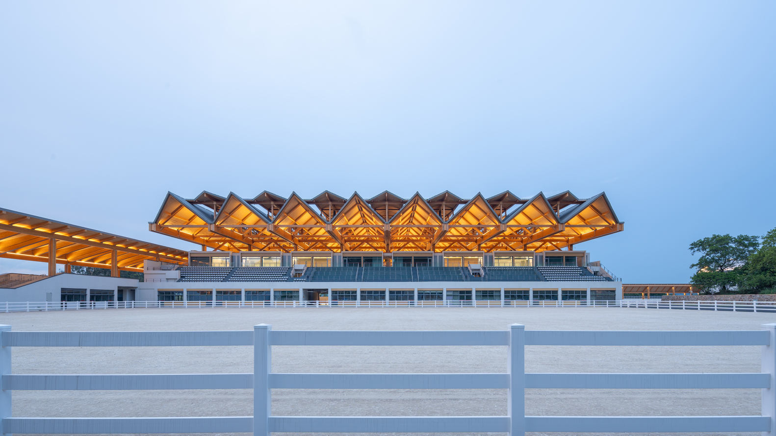 建筑造型与结构一体化,实现了室内外之间的透明性和互动性。连续的轻盈界面强化了建筑飞檐凌空的地域性文化特征,使建筑在大体量的基础上,仍具有漂浮感。一种透明的互动关系,众檐之下,山与风,光与影,人与马,共生共感,自然与共。