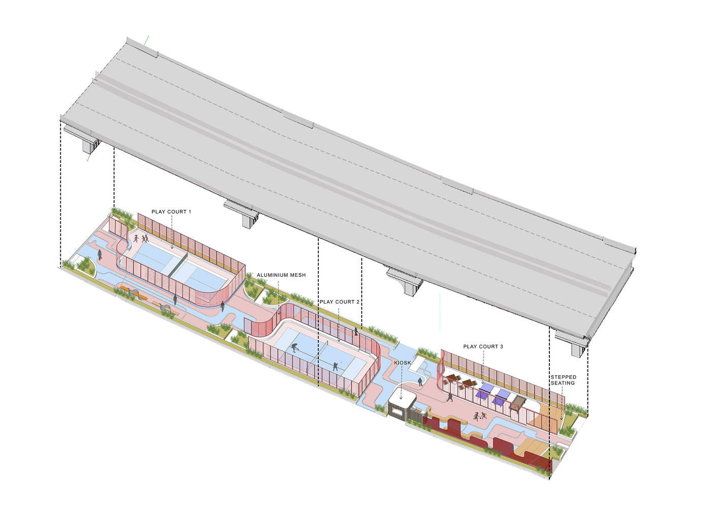 The design unfolds along a fluid pedestrian axis, paved with gravel that serves both as a guide and a non-slip surface. Along this soft boundary, a series of enclosed micro-cement sports courts gradually emerge, providing durable and high-performance surfaces. The entire area is enclosed by a lightweight aluminum mesh and polycarbonate shell, creating a sense of security, enclosure, and acoustic buffering amidst the bustling traffic, while maintaining visual transparency and environmental permeability.