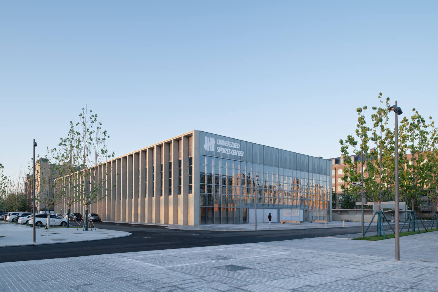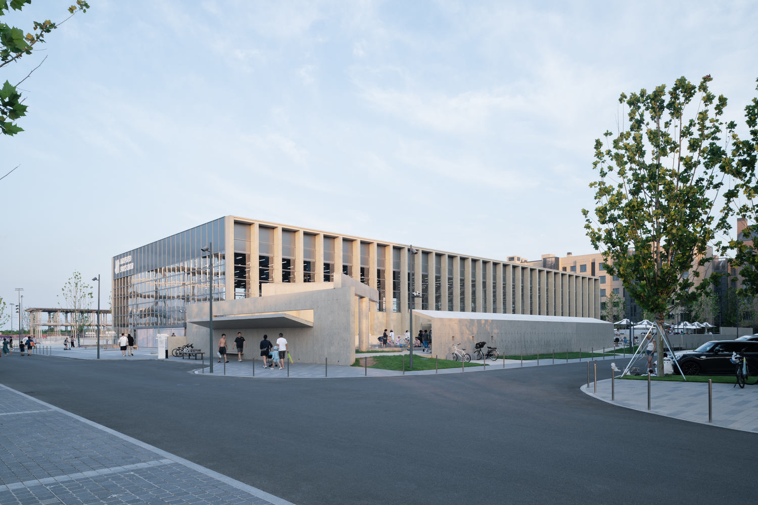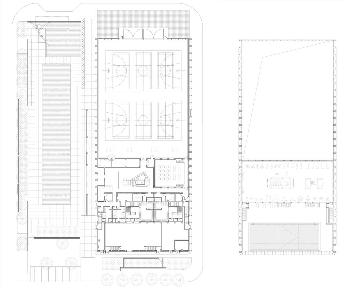 建成的体育中心是一个方盒子形态的大体量单体,长 78.2 米,宽 35.5 米,高 12.7 米。体量北侧的通高空间容纳两个室内篮球场,南侧通过夹层区分功能:首层设置门厅、柔术教室、更衣室与水处理设备,二层为健身房与室内泳池。从北侧看,体育中心是一个没有常规立面的建筑,通透的玻璃幕墙将内部空间完全展现,两扇 18 米宽的大门打开之后,社区人流可以不经过门厅区域,直接从街道进入篮羽馆和体育中心。这种灵活性的设计为该体育中心在社区更具多样化的使用场景提供了可能性,让体育中心可应对不同类型和规模的社区公共活动使用的需求。