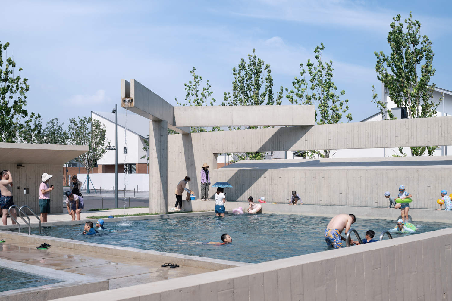 西侧室外泳池三面被高度、长度错动的混凝土墙体围合,界定入口并调节视线。兼备更衣功能的亭子既作入口雨篷,也成为泳池与主体建筑之间的缓冲。门厅设置于体育中心西侧,通过室外泳池区域进入。门厅长 20 米、宽 9 米,采用环岛式布局,虽然空间紧凑,却是体育中心最重要的动线枢纽。