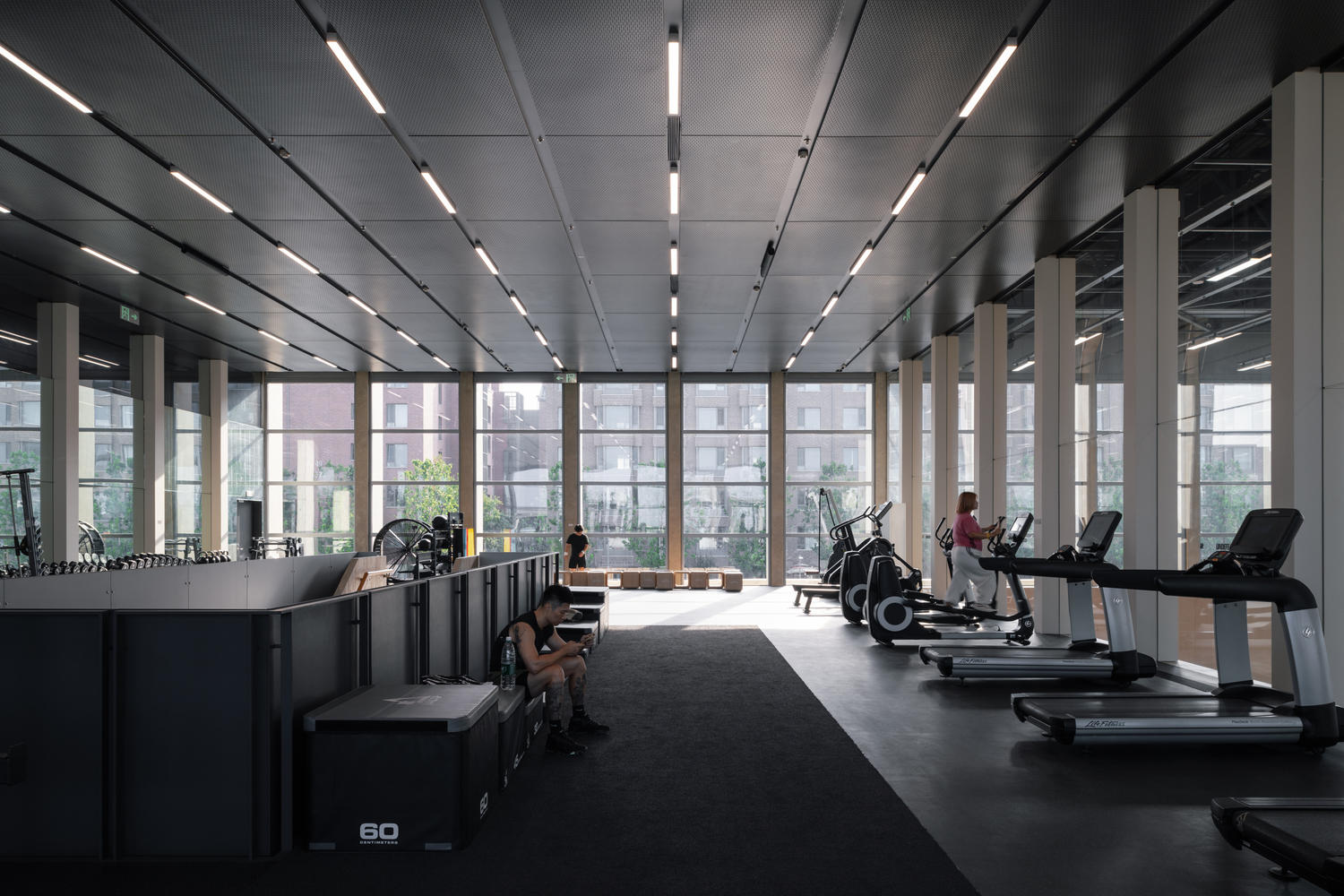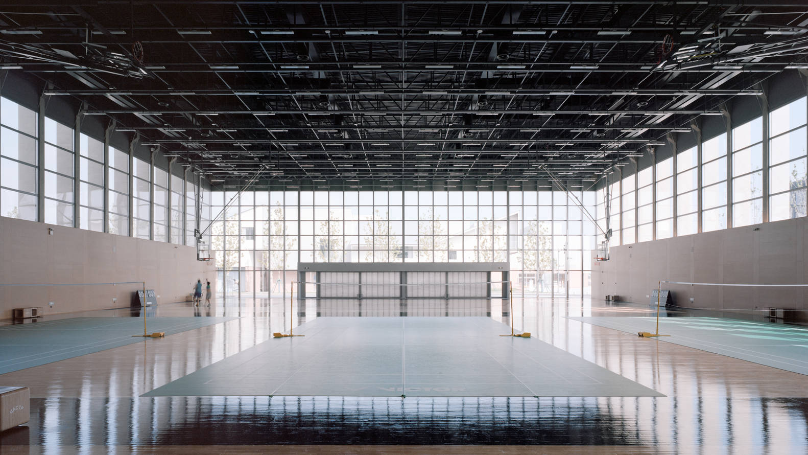 A unified lighting system is adopted indoors. The lighting above the basketball/badminton court is exposed, while the gym and indoor pool use suspended ceilings. The alignment of the lighting and service beams creates a continuous ceiling plane, enhancing the spatial quality derived from the frame structure system.