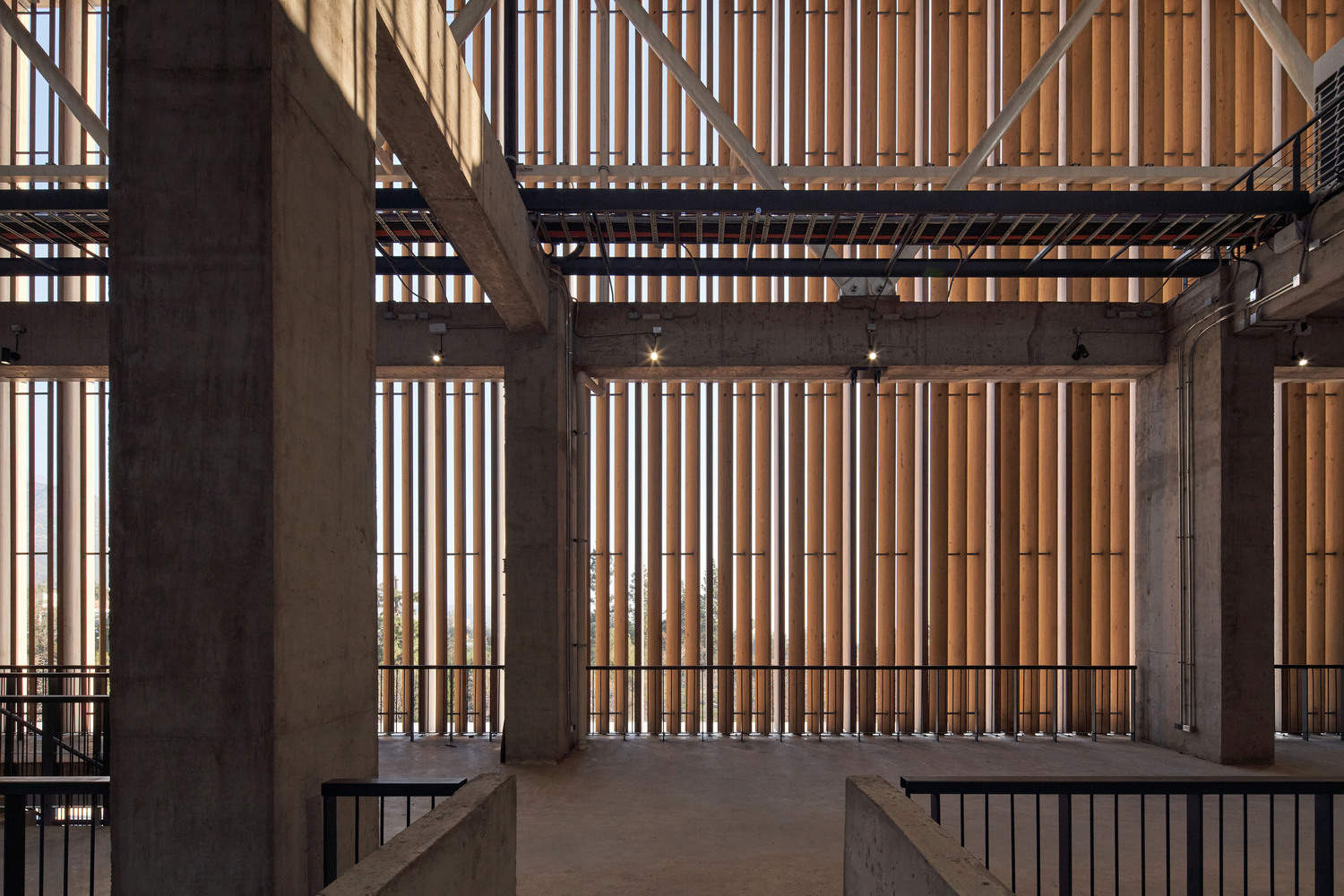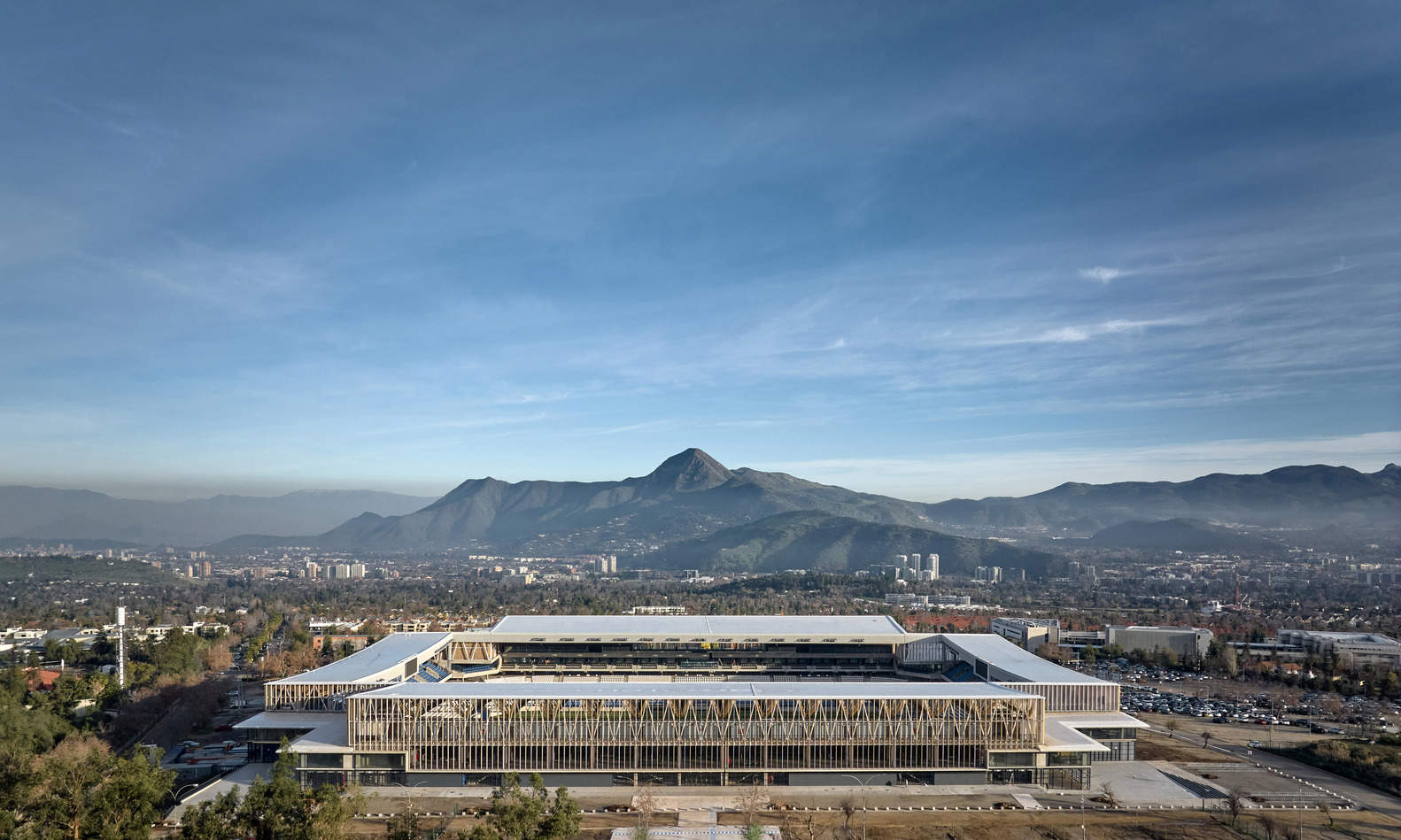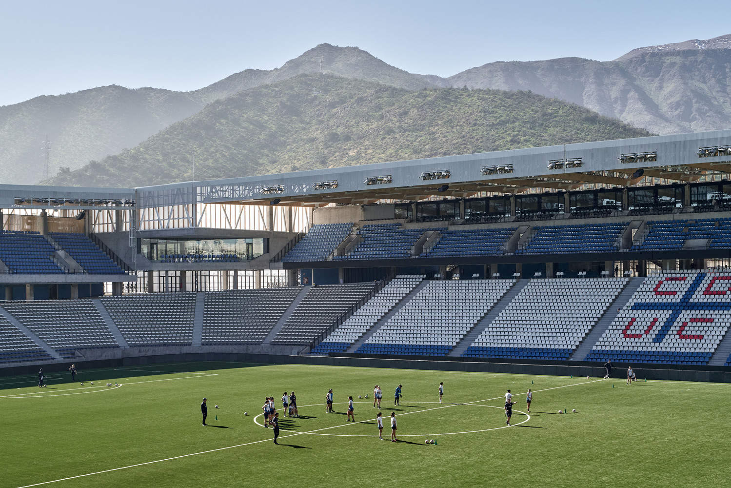 The stadium's enclosure system is designed to enhance environmental comfort in open, non-air-conditioned spaces. In the stadium expansion area (from the promenade level to the roof), vertical strips of Chilean Laminated Veneer Lumber (LVL) are placed every meter, integrated with LED lighting. Depending on the orientation, solar frames, acoustic panels, or ventilation openings are incorporated. A concrete band outlines the starting level of the façade, serving as a striking visual detail.
