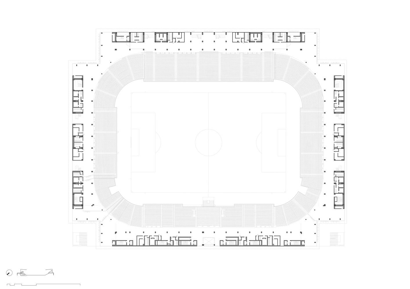 体育场布局采用矩形几何设计,优化了视线与功能布局。角落区域被打造为独特空间,不仅作为出入口标志,还提供多功能房间,可俯瞰景观与球场,既可用于比赛也可用于其他活动。