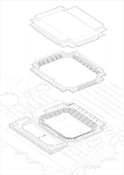 The stadium layout adopts a rectangular geometry, optimizing sightlines and functional distribution. The corner areas are designed as unique spaces that serve not only as entrance markers but also offer multi-functional rooms overlooking the landscape and the field, suitable for both matches and other activities.