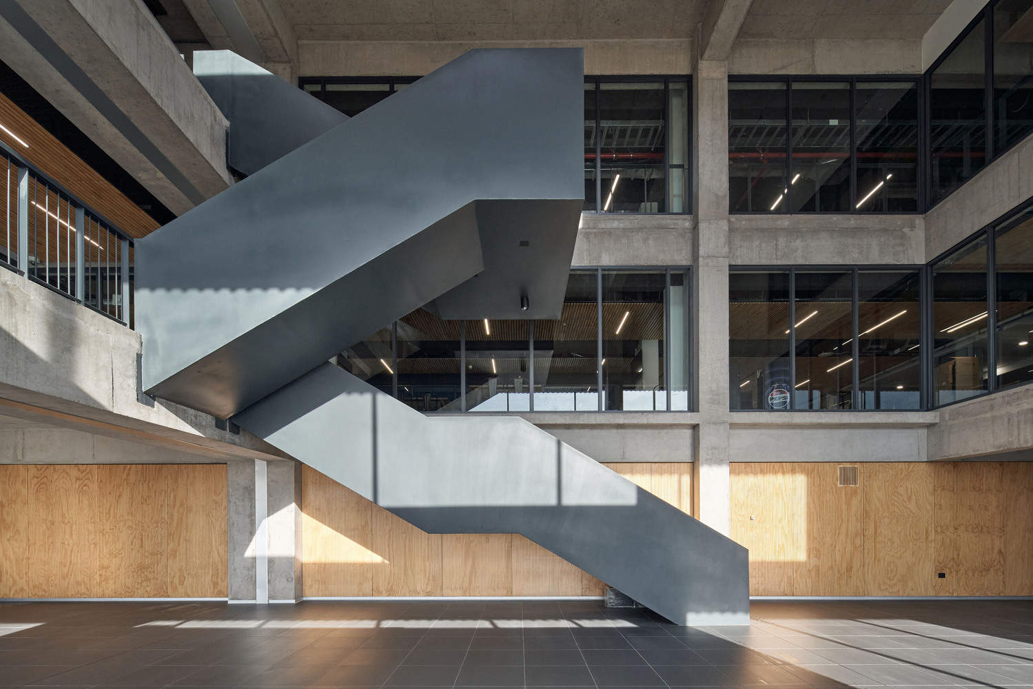 该建筑结构保留了原本完好且功能正常的混凝土部分,将干预措施降至最低。扩建部分以现有碗状看台为中心进行布局,采用混凝土梁和柱构建。转角处采用倒置混凝土与钢材的混合结构,优化受力性能并符合规范高度要求。