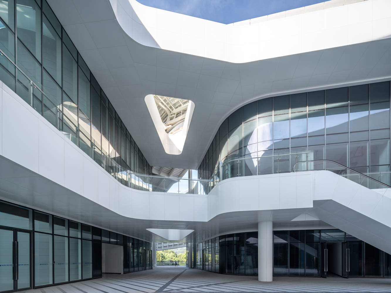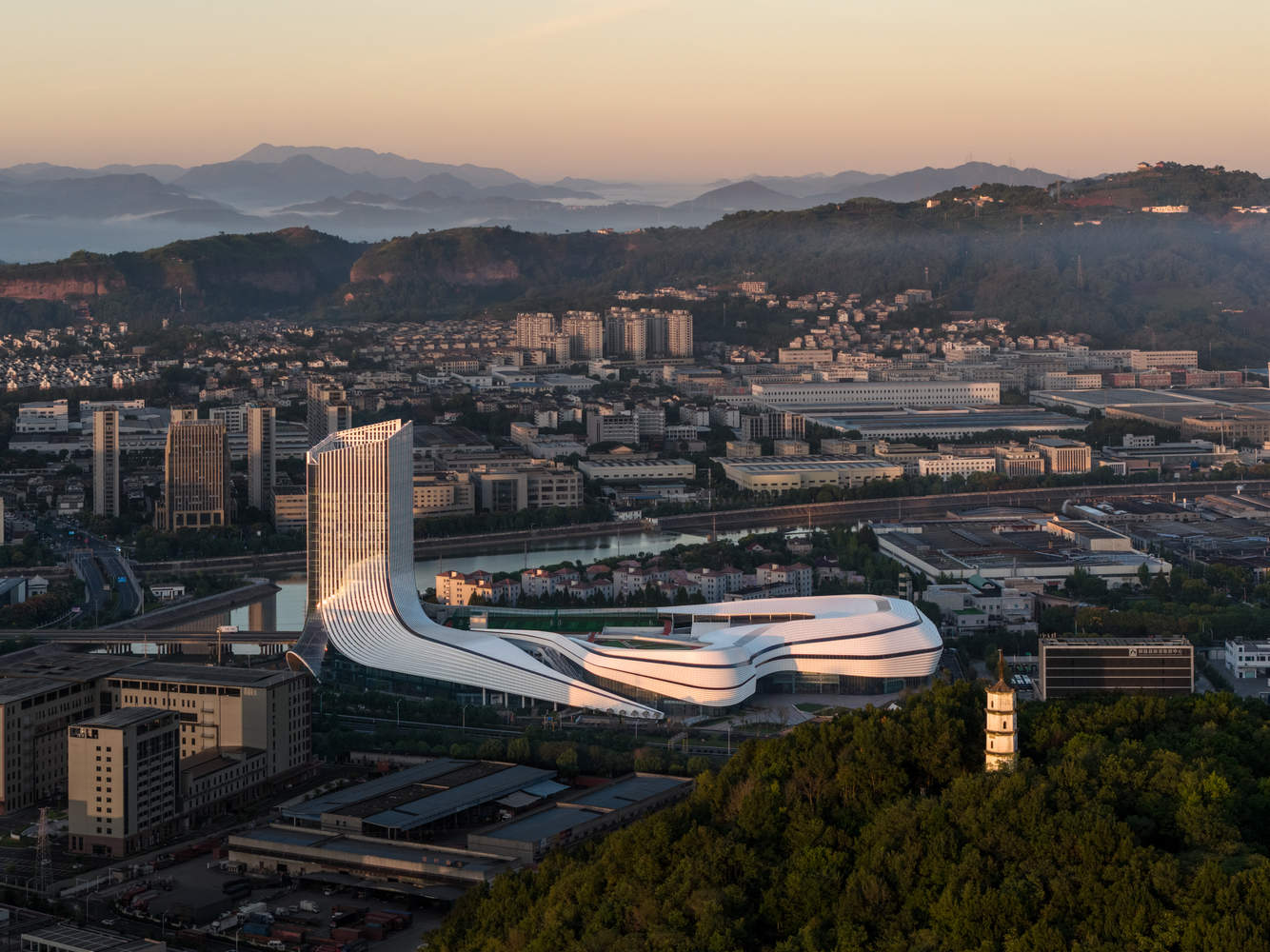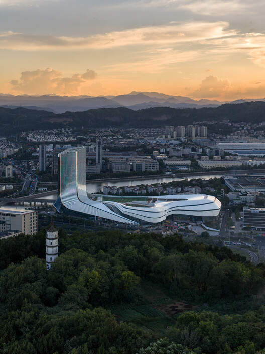 山水意象的在地化表达与结构效率:在建筑形态上,设计成功地从新昌“浙东唐诗之路”的奇峰秀色中汲取灵感,以水势和山形作为形态母题,创造出具有强烈地域文化符号和现代感滨水界面的标志性形象。结构上,采用大跨度桁架与框架核心筒体系,保证了内部空间的最大灵活性和功能适应性,同时兼顾了施工效率与经济性。这种在地化的美学表达与高效的工程技术相结合,使得建筑在视觉上富有吸引力,在功能上具备长久适应性。