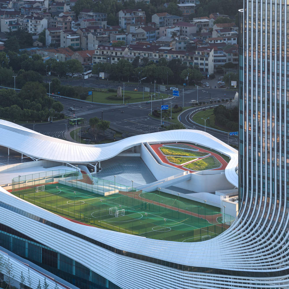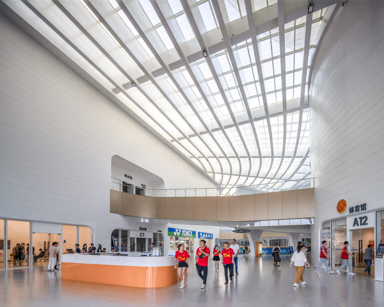“Sports Mall”原型:复合运营模式激活城市活力:本项目最核心的亮点在于其对传统体育场馆运营模式的颠覆性创新。针对县级城市体育场馆普遍利用率低、运营成本高的痛点,line+ 事务所提出了“Sports Mall”原型,采用“1+N”的复合运营模式。设计将体育场馆从传统的“赛事容器”转变为日常的“城事发生器”,通过融合商业、休闲、社交、文旅等多元业态,确保了场馆在非赛事期间的活力和经济可持续性,有效解决了运营困境,为县域城市发展提供了可复制的城市激活模型。