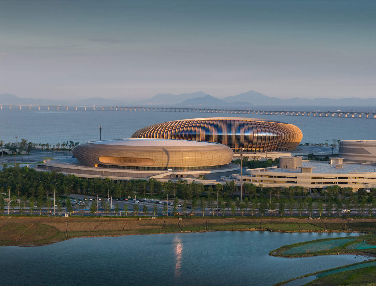 体育场屋顶采用多层系统设计,为 6 万名观众提供遮雨与遮阳,同时允许升腾的热空气自然排出建筑外。这一独特的环形分层屋顶仿若传统中国折扇的褶皱丝结构。体育中心位于从北侧通往深中通道的主要入口位置,该通道连接着大湾区的主要城市。体育中心沿珠江的建筑形态标志着通往广州及大湾区北部各区的门户。