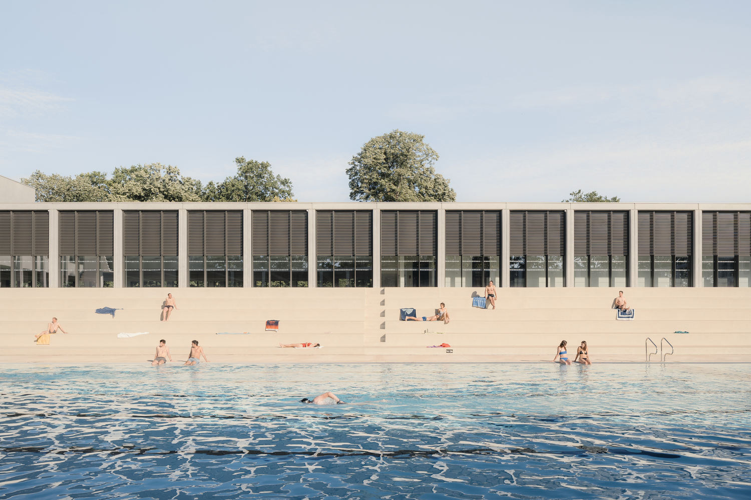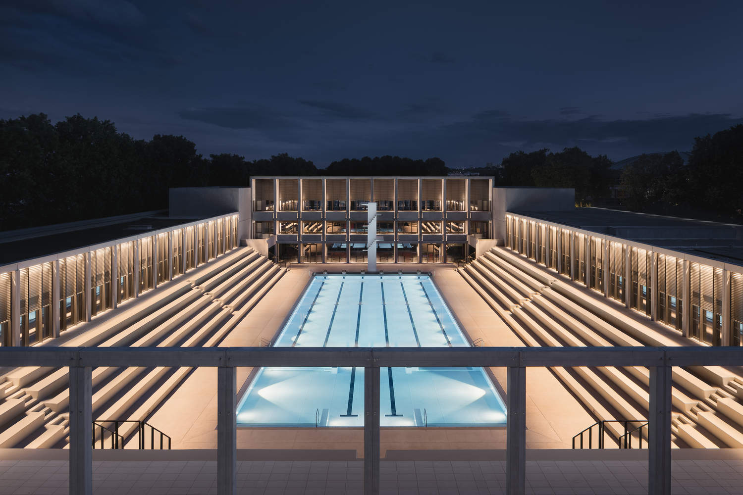 The focus of the project is the enhancement of this entrance, along with the existing pool, stands, and diving board. To implement this upgrade, three main building volumes are connected by a central block, creating a gradually increasing height. The highest volume serves as a backdrop to the swimming pool and the historic diving board, which has now been transformed into a sculptural piece. The two lower volumes frame the renovated stands.