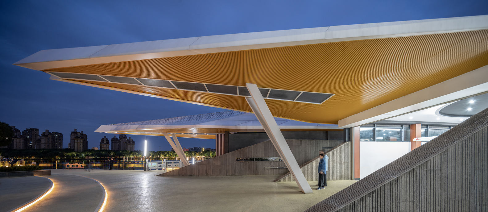 两个体块之间的带状空间被巧妙地设计成了兼顾交通与展示功能的赛艇展廊,艇库内部用于赛艇储藏,在外部游客可透过片墙上的玻璃条窗看到内部展示的赛艇。两个建筑体的屋面平台通过连廊互通,可用作高视角的观赛区和日常休闲区。建筑的使用上满足用时和平时的多场景转换,最大化建筑对专业功能和城市功能的价值,同时周边景观与建筑一体化设计,设置多个观赛点与停留空间,提升互动性与趣味性。
