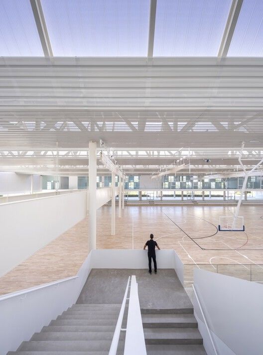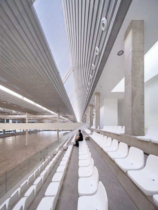 From the architect. The San Vicente del Raspeig Municipal Sports Pavilion is configured as a large, highly versatile container capable of hosting multiple sports modalities and large-capacity events in general, where the visual connection between the interior and exterior becomes one of the fundamental guiding threads of the project with the aim of making the practice of sport visible from the outside as a measure to promote sport.