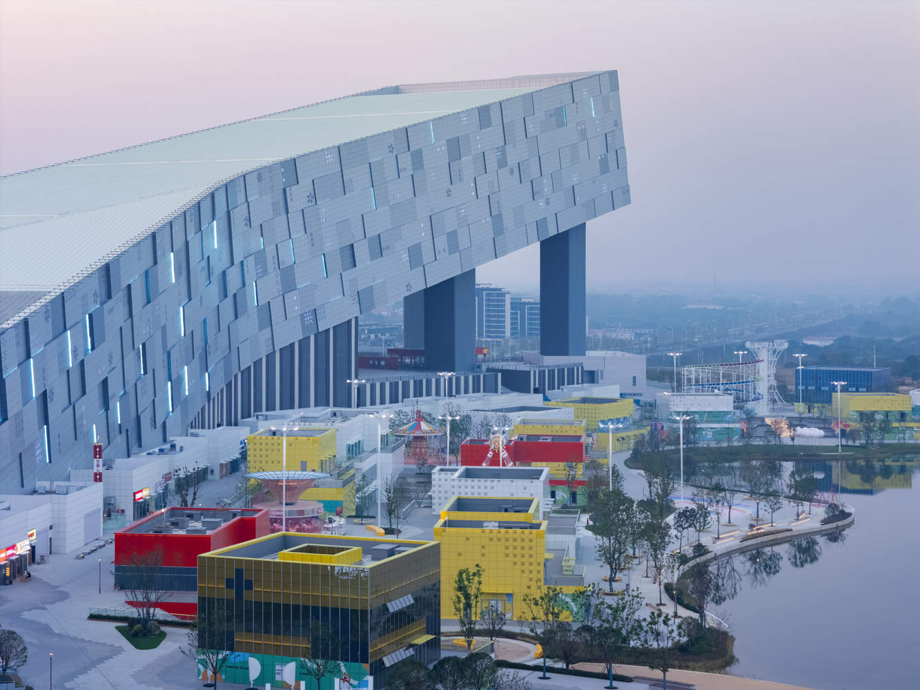 Wuhan Ganlu Mountain Snow World is a super-large commercial complex surrounding a central lake area, integrating various facilities for entertainment, sports, and retail. The architectural massing with large public terraces complements the three-dimensional pixel-themed exterior facade, creating a visually engaging contrast.