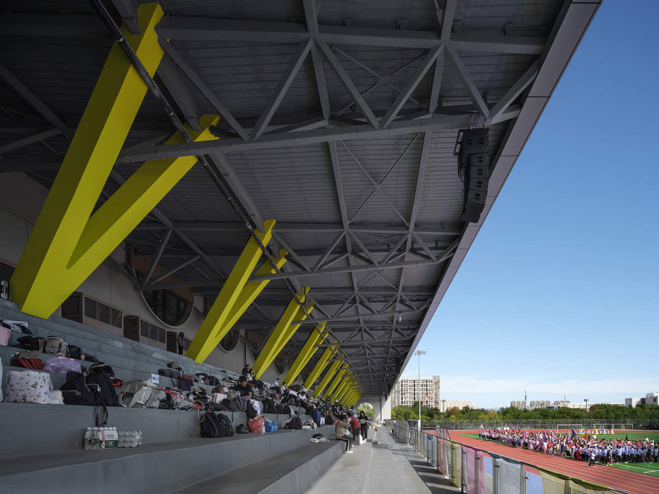 场地内的建筑体量适中,多层次的室内外连廊、平台广场、坡地绿化将多功能的建筑进行有机连接,室内外空间充分融合,使得场馆处处充满活力,建筑与自然的和谐共生。建筑面向场地布置了不同的功能入口,以开放的姿态面对大众。
