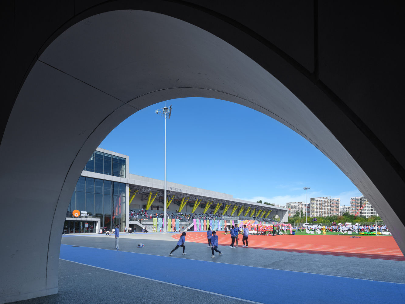 项目位于北京回龙观大型城市居住片区内,包含体育健身中心与文化艺术中心两个功能板块,项目的建成弥补了回龙观高密度住宅区文体配套缺失的痛点,是北京“回天行动计划”的重点项目之一,项目服务周边 55 个社区、惠及 40 余万人口,与北侧的运动公园有机结合,旨在打造一个“开放性、兼容性”的市民室内外活动场所,项目将融合发展的理念植入场馆规划,为区域居民提供了一处高品质的文体活动场所。