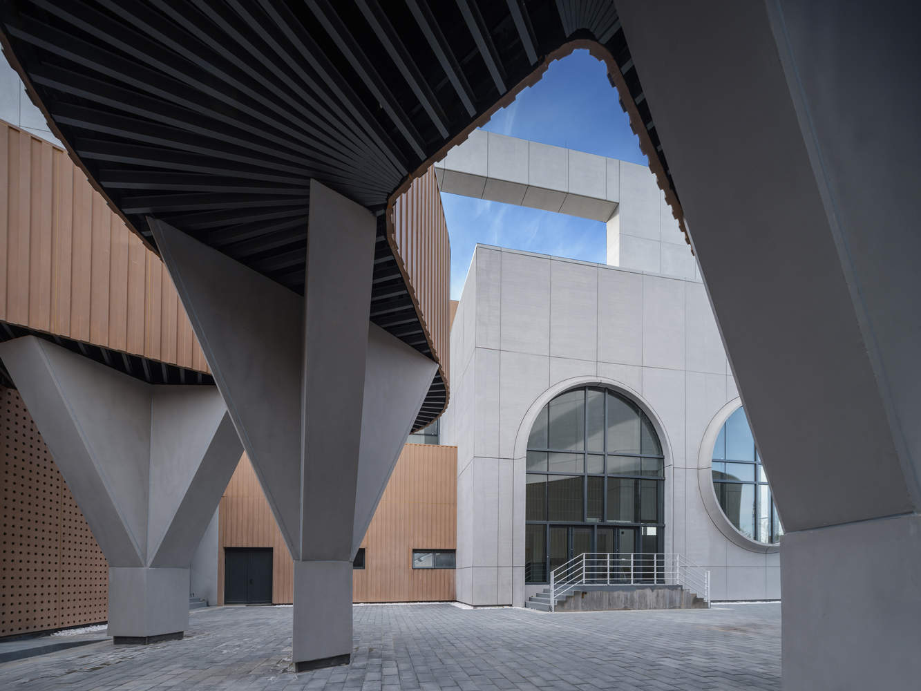 The architectural volumes on site are moderate in scale. Multi-level indoor and outdoor corridors, platform squares, and sloped green spaces organically connect the multifunctional buildings. Indoor and outdoor spaces are fully integrated, making the venues vibrant everywhere and achieving a harmonious coexistence between architecture and nature. The building features different functional entrances facing the site, presenting an open posture to the public.