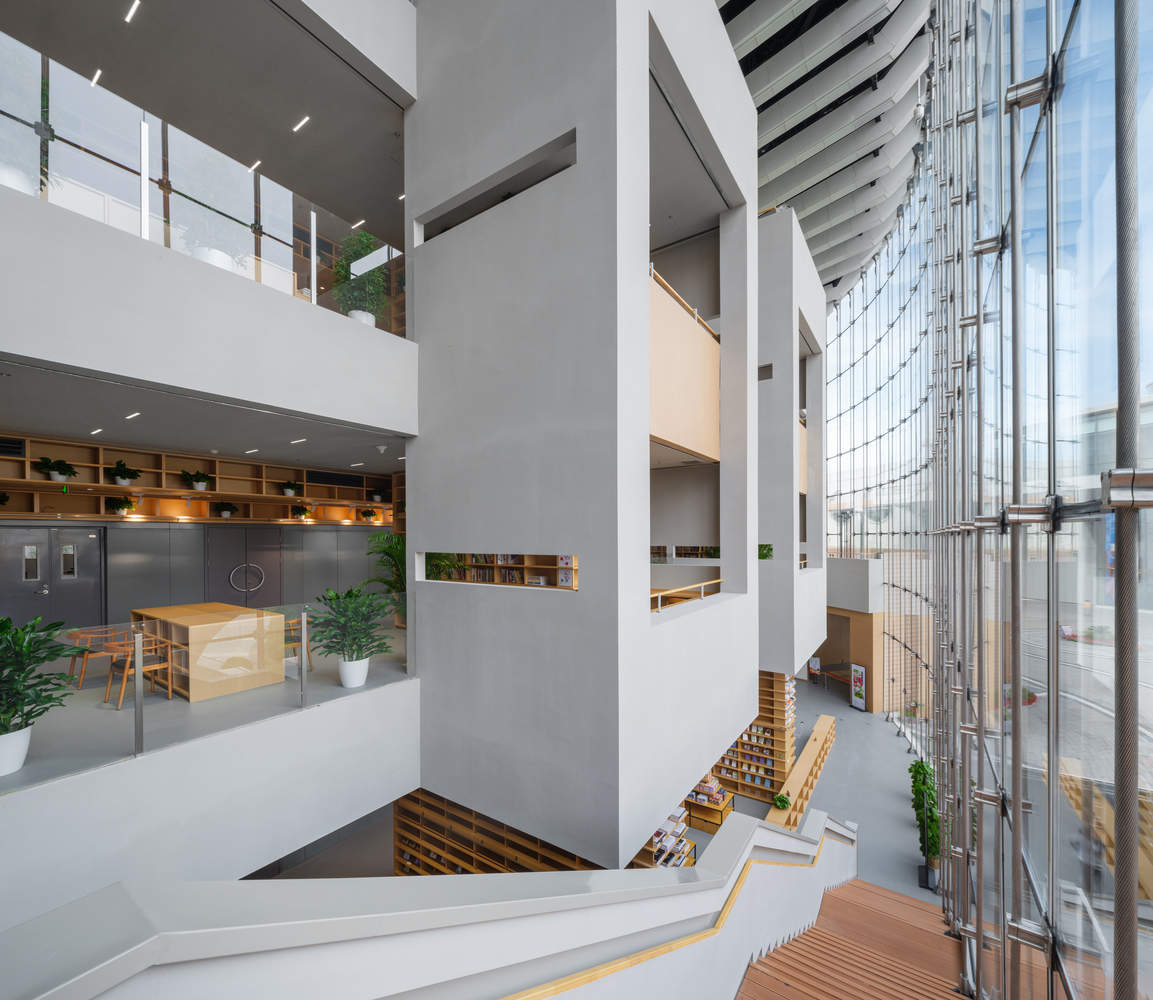 图书馆集展览、阅读、文创、社交功能为一体,通高 4 层的中庭空间将北侧运动公园的绿意引入室内,营造出舒适惬意、绿意盎然的氛围,入夜后通高的玻璃幕墙又如一盏巨型灯笼,将城市的文化生活点亮。