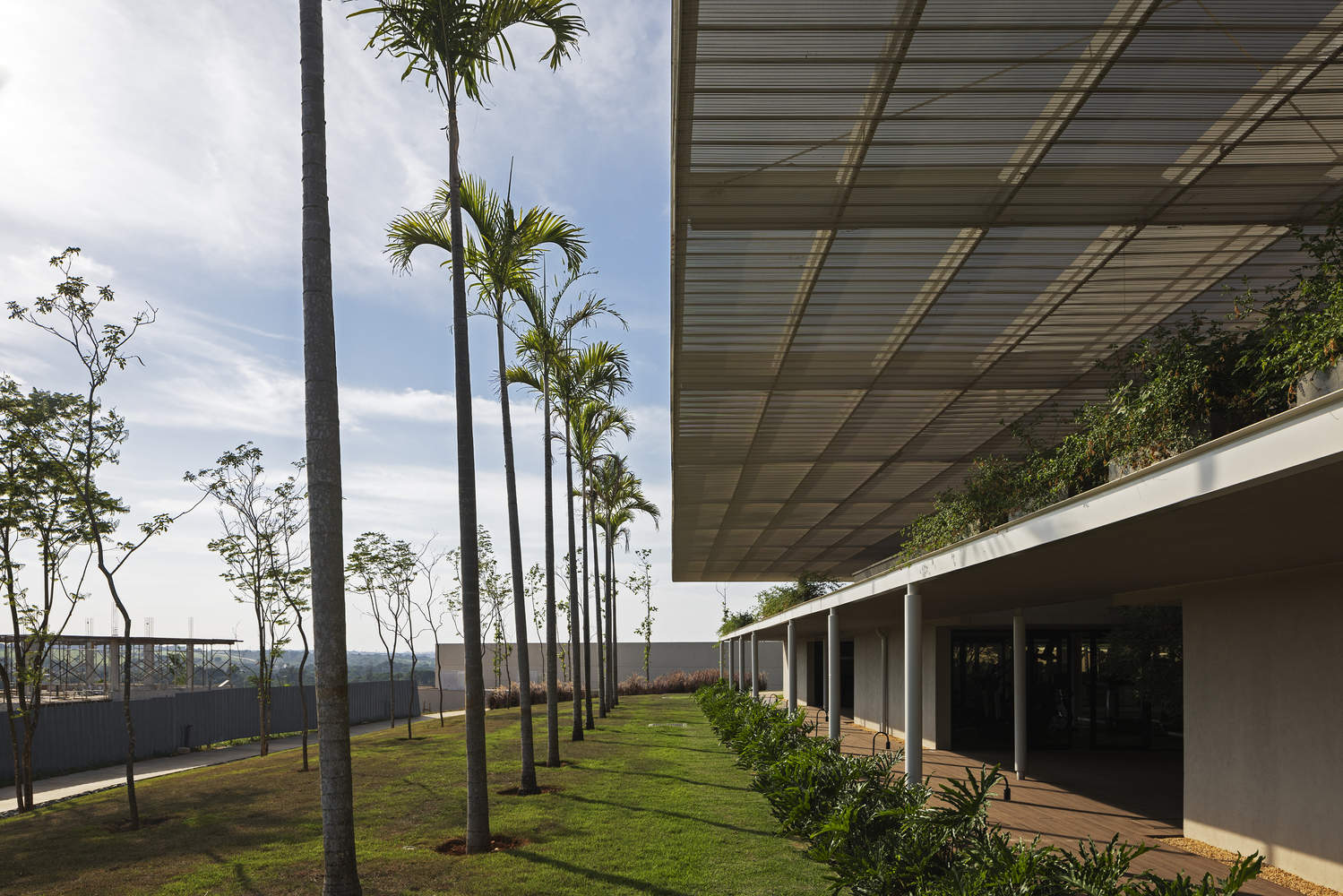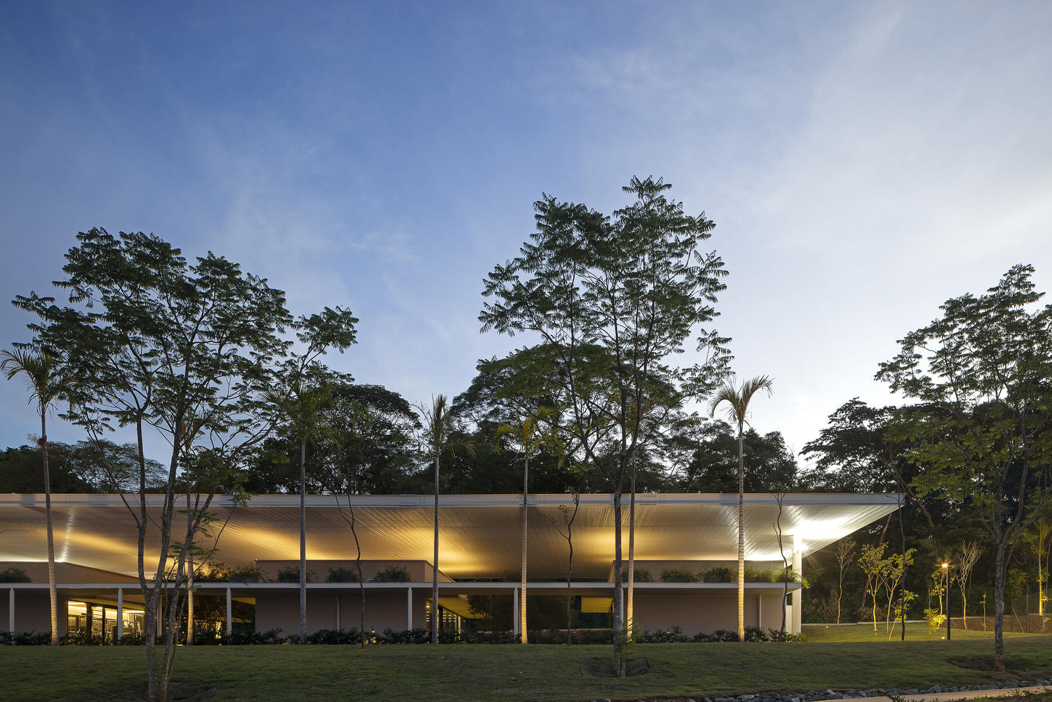 气候策略与景观融合:建筑师通过“大型遮阳结构”这一核心设计手法,成功应对了戈亚尼亚当地的酷热气候,为内部训练空间提供了必要的遮蔽,同时保持了空间的最大通透性。这种结构设计是场地适应性设计的典范,使得室内活动区能够与周围的自然景观和森林环境实现无缝连接和视觉渗透。连接区的小吃吧更是强化了这一点,成为一个观景与社交的节点,真正实现了建筑对自然环境的尊重与借用。