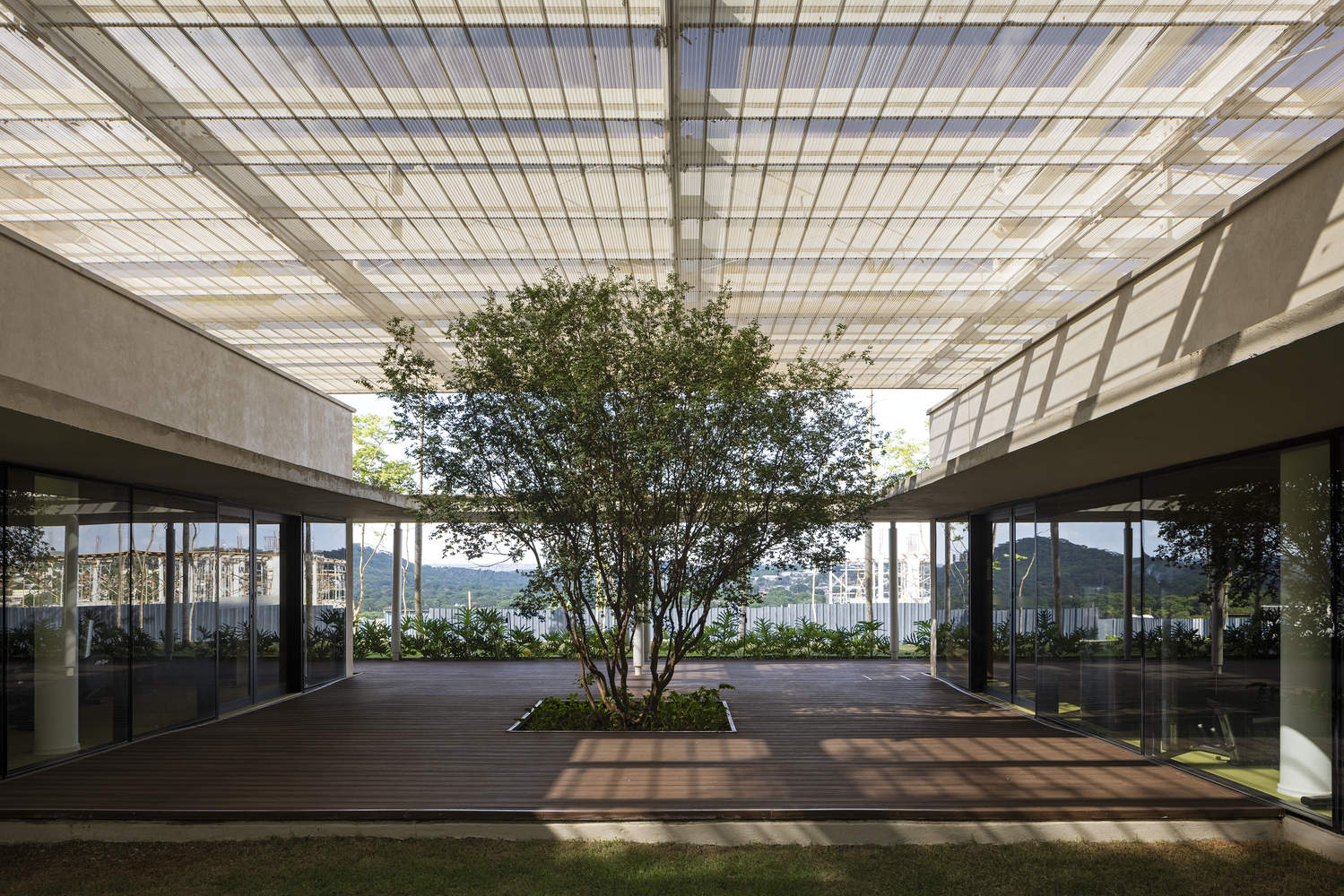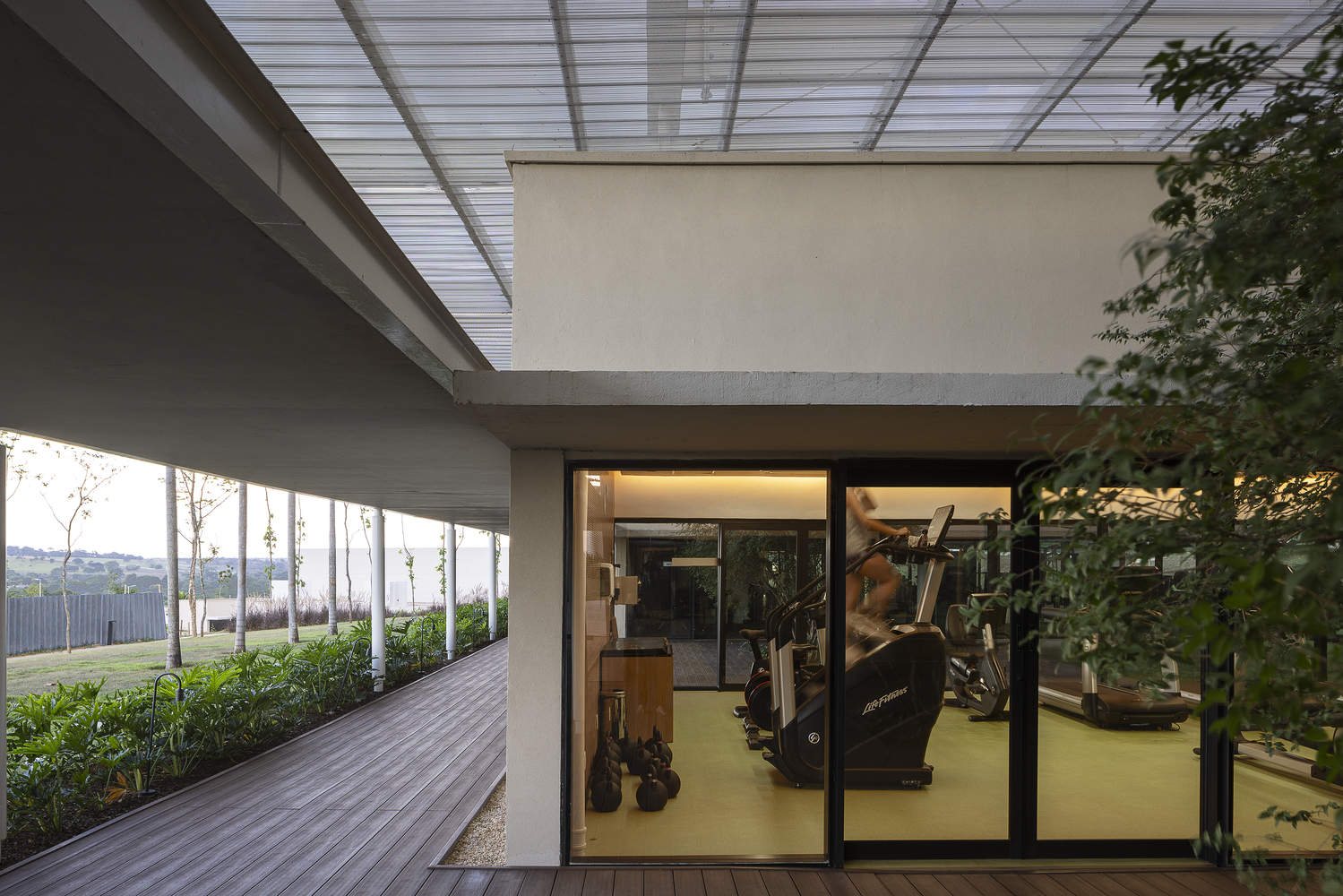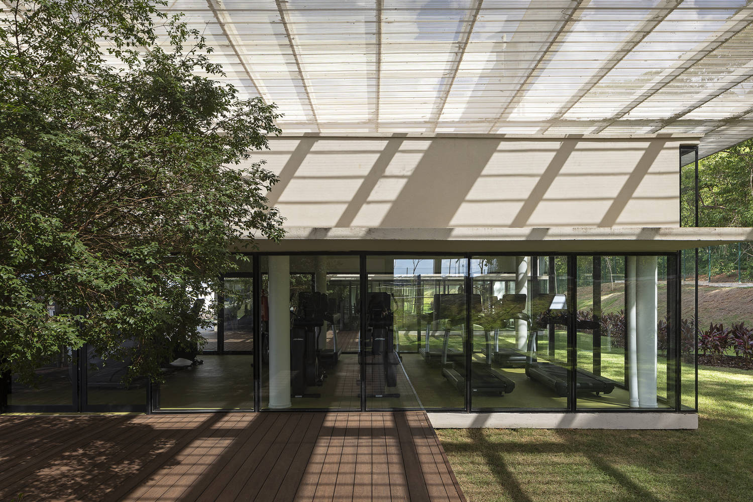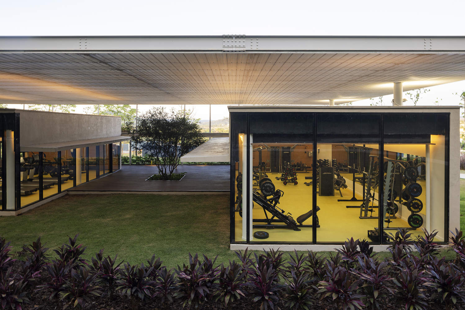 在第二区域内,力量训练室、有氧运动室和普拉提室均位于一座大型“遮阳”结构之下,既能免受当地酷热的侵袭,又能保持空间的通透,与周围的景观和森林完美融合。