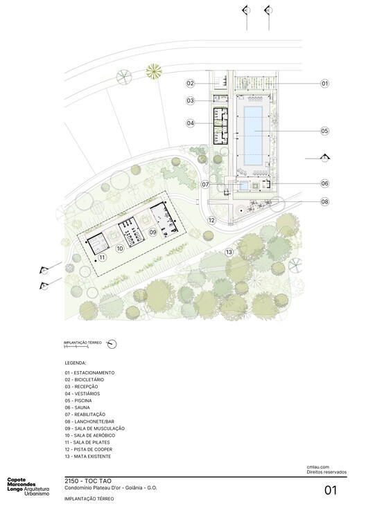 The new Plateau D'or fitness center in Goiânia (GO) is designed to serve the apartment residents, divided into two main areas. The first area houses the swimming pool, sauna, and rehabilitation/physiotherapy rooms; the second area offers strength training, aerobics, and Pilates classes.