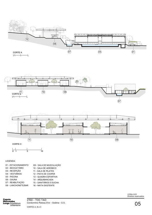 位于戈亚尼亚市(GO州)的 Plateau D'or 新健身中心旨在为公寓居民提供服务,该中心分为两大主体区域。第一区域设有游泳池、桑拿房和康复/理疗室;第二区域则提供力量训练、有氧运动和普拉提课程。