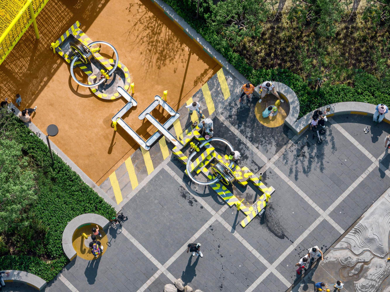 The eastern side features a dining area, including a beer garden and outdoor dining. Adjacent to the dining area is the play zone, which features a curved and layered playground, sandbox, and fountains, centered around a bright yellow canopy. The west side is the maze area, mimicking the winding streets of the ancient town, containing four distinct zones—a hedge maze, an earth maze, a wooden maze, and a water maze. The maze also serves as a metaphor for the learning process, in which everyone is constantly striving to find their own path. The ecological effect of the site is closely related to its size. Although this park occupies a relatively small area, its design embodies the concept of "high density," maximizing ecological effects and enhancing environmental awareness through interactive landscape elements. The central landmark of the park is a large sculptural element, which is actually a geothermal chimney that emits heated water vapor naturally produced in the area. One of the highlights of the project is the "Water Play Hills," an interactive hydrological model that showcases miniatures of the Yangtze River Delta landscape, the Three Gorges Dam reservoir, and the ancient Dujiangyan irrigation system.