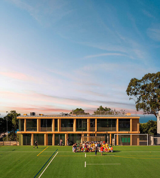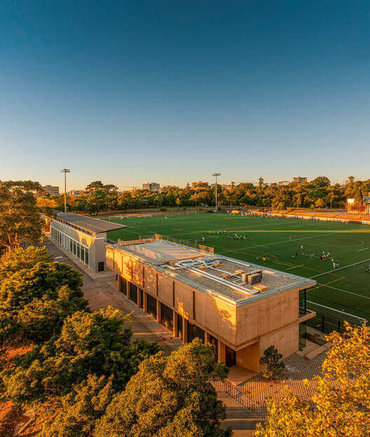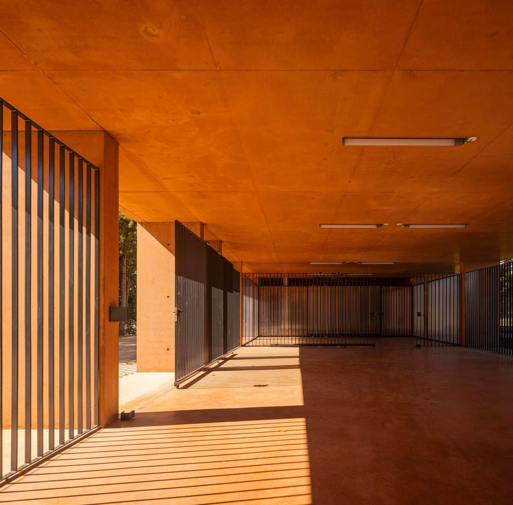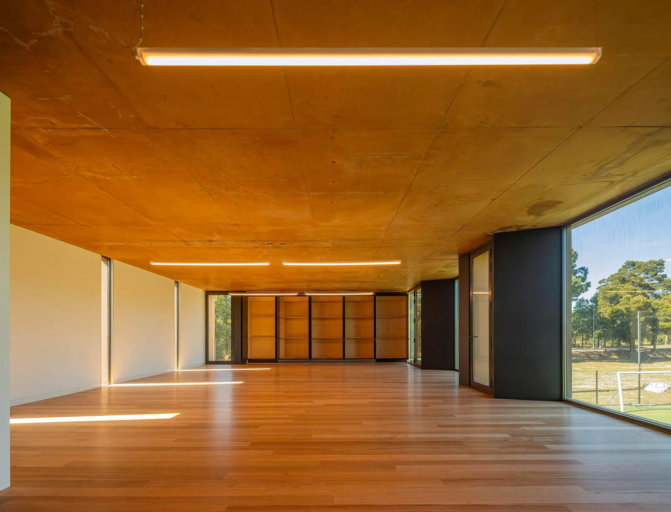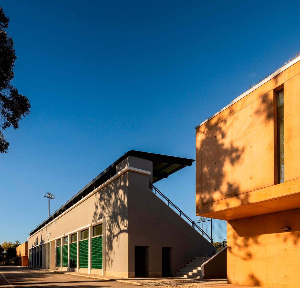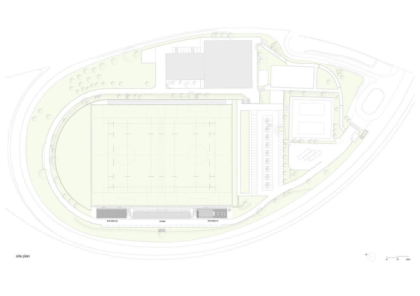 On the east side, the building volume extends towards the sports field, creating an open visual connection. Its concrete facade features a rhythmic composition of columns, some forming cantilevered balconies, others transforming into large-scale framing views that incorporate the green turf scenery. The overall project continues the restrained character of the original grandstand, refined and reinterpreted in the design language of the new structures. The building's exterior facade uses pigmented concrete, which extends into the interior spaces, where terracotta-colored ceilings and floors inject a subtle vitality into the sober base tone, creating a delicate contrast with the rational expression of the grandstand and the natural texture of the surrounding tree canopy.