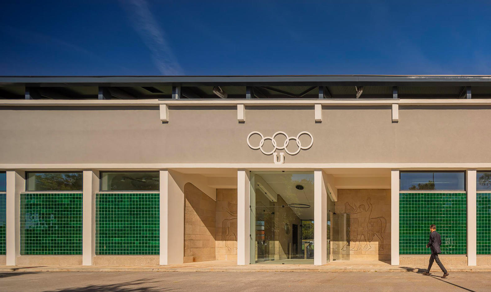 The original grandstand building was influenced by Rationalism, presenting a symmetrical and rigorous composition on the facade facing the main entrance, defined by a rhythm of columns culminating in the entrance loggia—a colonnade facing the street, serving as a transitional space into the stadium. Notably distinctive are the granite bas-reliefs on the building, featuring carvings inspired by classical mythology and ancient Olympic games, reinforcing the building’s historical narrative. Alongside structural repairs, the interior spaces were reorganized to accommodate the stadium’s support functions, with access points located centrally in the street-facing loggia to ensure direct accessibility to the sports field.