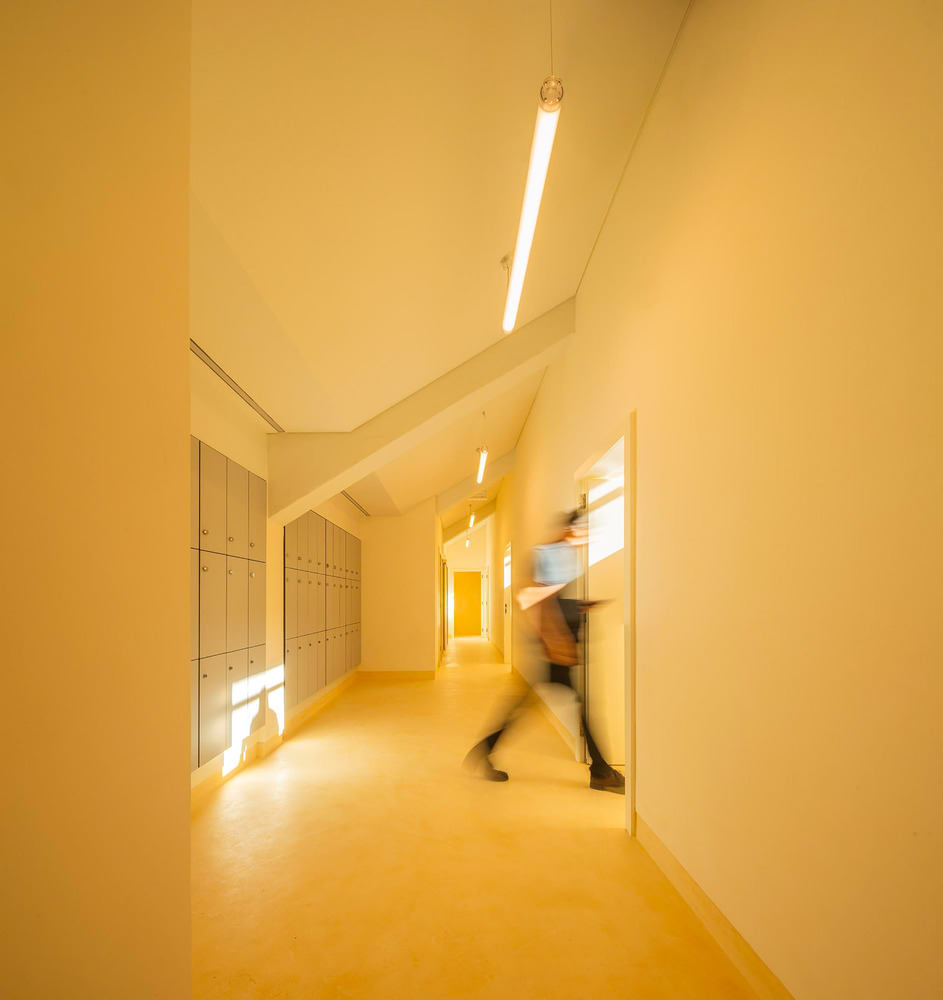 材质语汇的沉稳与细节:建筑在材料选择上体现出高度的成熟度。着色混凝土作为主要立面材料,延续了基地的克制感,并通过富有韵律的柱列和悬挑阳台,形成了富有节奏感的韵律。室内外材质的统一(混凝土立面延伸至室内),辅以陶土色的天花和地面,在沉稳的基调中注入了微妙的温度和活力。这种材质的纯粹性与细节处理,不仅强化了建筑的纪念性气质,也使其在视觉上与周围的自然肌理形成了精妙的对比与和谐。