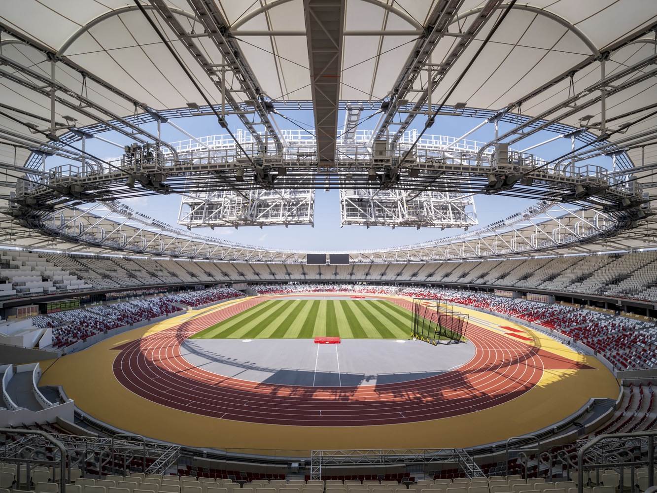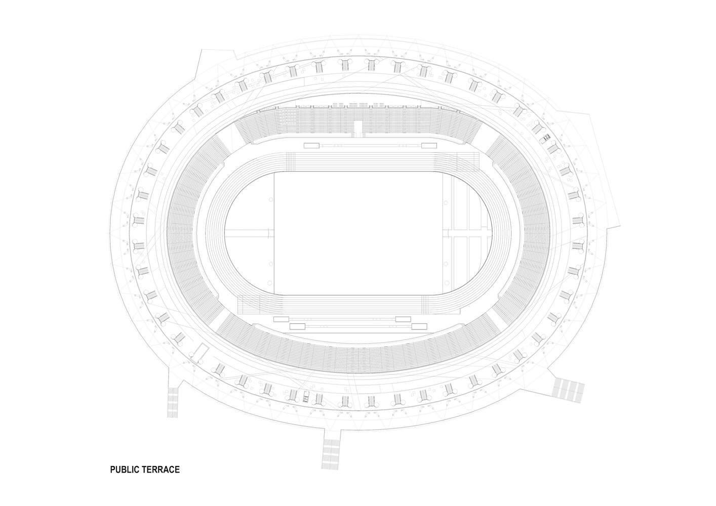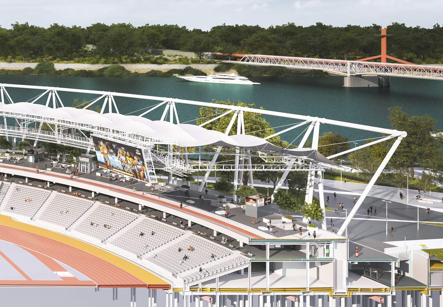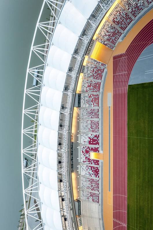 “开放竞技场”理念的创新实践:本项目最精髓的亮点在于其革命性的“开放竞技场”设计理念及其两阶段的生命周期管理。最初为满足 2023 年世锦赛需求而建的 35000 座体育场,在赛后通过拆除临时看台,无缝转换为一个 15000 平方米的永久性、面向公众的休闲公园——“开放城市环”。这种从“为赛事服务”到“为市民服务”的平滑过渡,通过跑道、健身区和餐饮设施的植入,确保了建筑全年 365 天的活力和使用率,是大型体育设施可持续运营的典范。