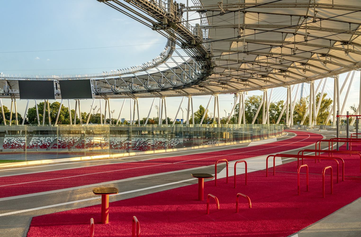 In terms of sustainability, the project was realized by eliminating a derelict industrial area on the southern bank of the Danube in Budapest and restoring the entire 20-hectare area. The goal was to create a new, open, multi-functional athletics stadium and public park for sports enthusiasts and city residents looking to relax. In the center of the park, the Hungarian National Athletics Stadium was built in competition mode to accommodate 35,000 people for the 2023 World Athletics Championships in Budapest. After the World Championships, the base design of the athletics stadium building was completed in 2024. The temporary upper stands were dismantled and replaced by a 15,000-square-meter open, illuminated leisure park—the "Open City Ring"—featuring a running track, family jogging paths, street fitness areas, training zones, and street food services. The objective was to build a high-capacity stadium capable of hosting the World Championships, but subsequently, to open it up as much as possible to the public, allowing for public participation in mass sports and athletics 365 days a year.