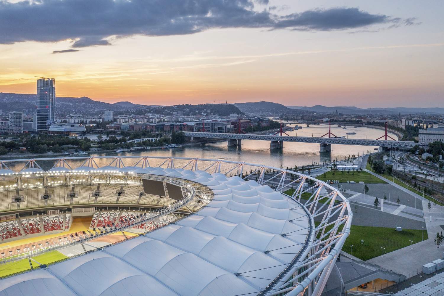Throughout the stadium's surrounding development area, from the Rákóczi Bridge to the Kvassay Lock, extending via the new cable car bridge to Northern Csepel, new flood protection facilities, riverside promenades, bicycle paths, and boat stations were constructed. As the development project progressed, pedestrian, bicycle, and water connections for the entire North and South Pest quay areas were realized, leading to the southern part of the city. The aim is to create an attractive recreational community for city residents that can become part of the European Union and Hungarian ecological networks. The sustainability of the new "green" investment is based on maximum sustainability, thanks to its continuous use as a multi-functional activity area and its renewable geothermal energy system. In reducing environmental impact, the system prioritizes public transport solutions and walking/cycling over car traffic. The structural support system of the stadium is a unique tensile roof structure built with optimized steel consumption, heating only the areas most functionally important to the building's interior, approximately 10% of the total area. Considering these sustainability aspects, NAPUR Architect Kft. designed Budapest's new "Open Arena" in 2024, taking into account engineering, construction, and operational aspects.